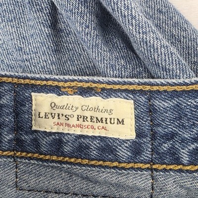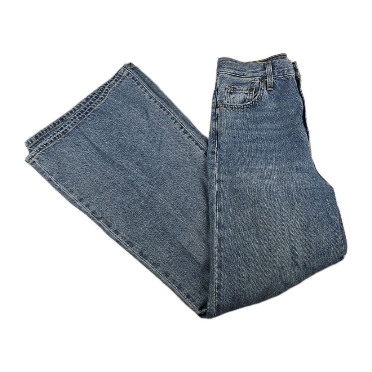 The product is a pair of Levi's Premium Jeans for women in a high loose flared fit, featuring a distressed light wash in a blue color. These jeans are in a size 26 with a 27-inch waist and a relaxed fit. Made from a blend of lyocell and cotton denim, they are machine washable and have a 5-pocket design with a coin pocket. The jeans are accented with buttons, zippers, and the Levi's logo, and are themed as hipster, beach, hippie, grunge, bohemian, college, retro, and 60s and 70s inspired. They are designed for comfort and stretch, perfect for all seasons.
