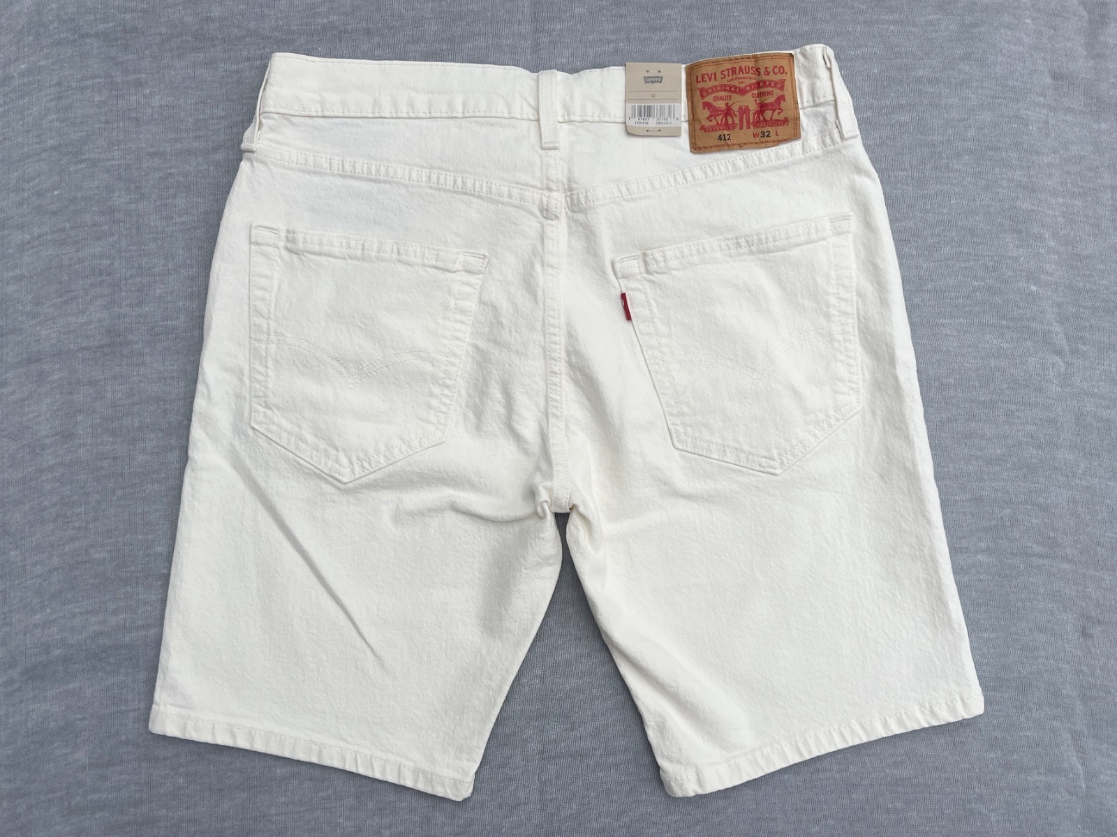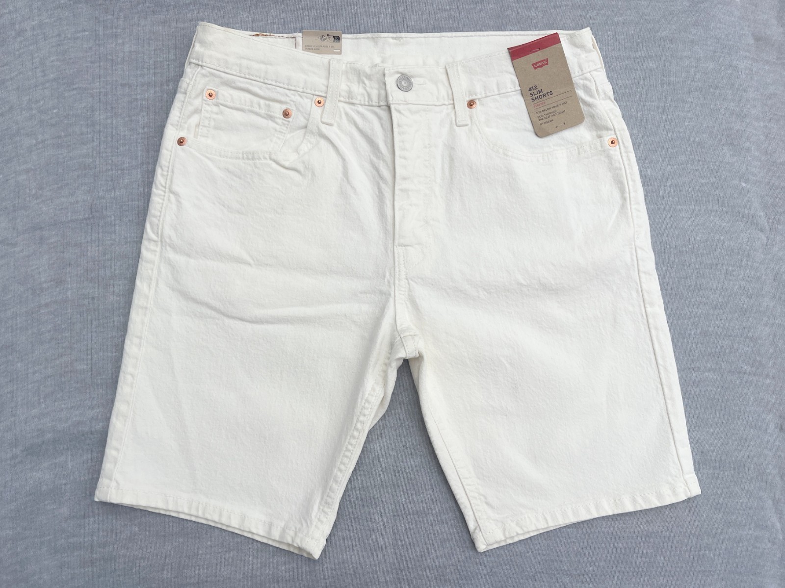 - Levis Red Tab 412 Mens Off-White Slim Fit 9" Stretch Hemmed Denim Jean Shorts