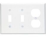 Leviton Combination Wallplates come in a variety of configurations and gangs, and are available in a broad selection of materials including, aluminum, brass, stainless steel and plastic, and in an assortment of colors. If you have a unique application, Leviton can also customize a wallplate for a specific job. 3-Gang 2-Toggle 1-Duplex Device Combination Wallplate, Midway Size, Thermoset, Device Mount, White.