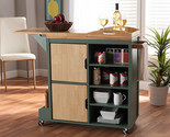 Effectively expand your kitchen's working surface and storage space with the Quinn kitchen cart. Showcasing a vibrant two-tone green and natural finish, the Quinn features four open shelves for spices, plates, and more. Two doors open to reveal additional storage space. An extendable drop leaf tabletop creates extra counterspace , while a detachable tray enables easy serving. Smooth swivel wheels provide swift mobility. The Quinn kitchen storage cabinet is made in Malaysia and requires assembly.