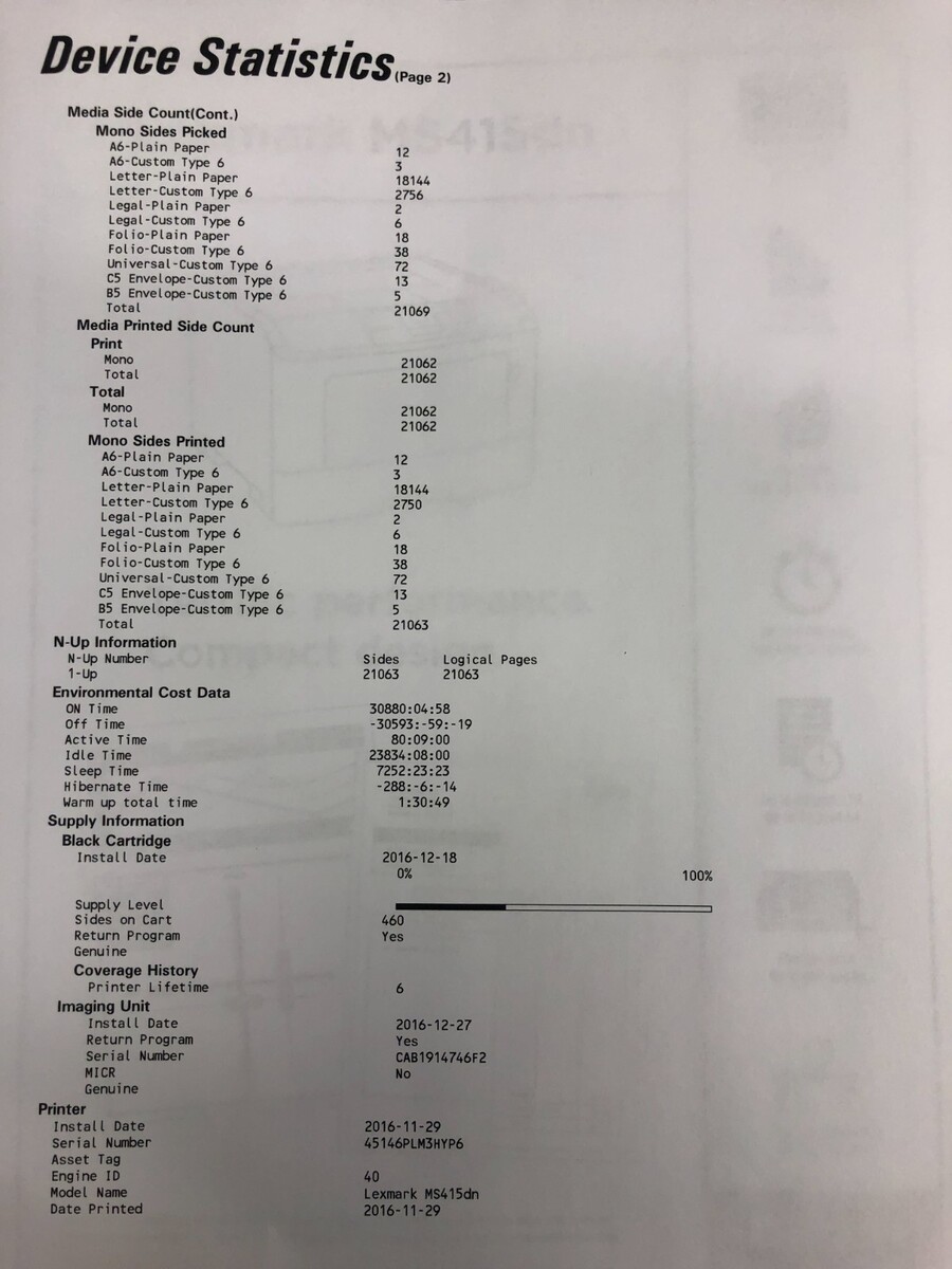 - Lexmark MS415DN 35S0060 Duplex Network Monochrome Laser Printer 35ppm 55k pages!