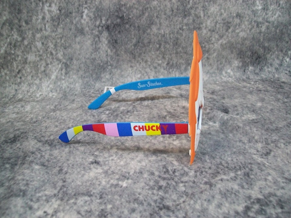 Sun-Staches Chucky Costume Glasses. Lens look blue from the front but have a smoke tint when looking through them. One size fits most. Could also be worn by adults. Novelty Glasses for cosmetic use. Does not provide any vision correction. 100% UV Protection Impact Resistant Lenses. Unisex: Male or Female.