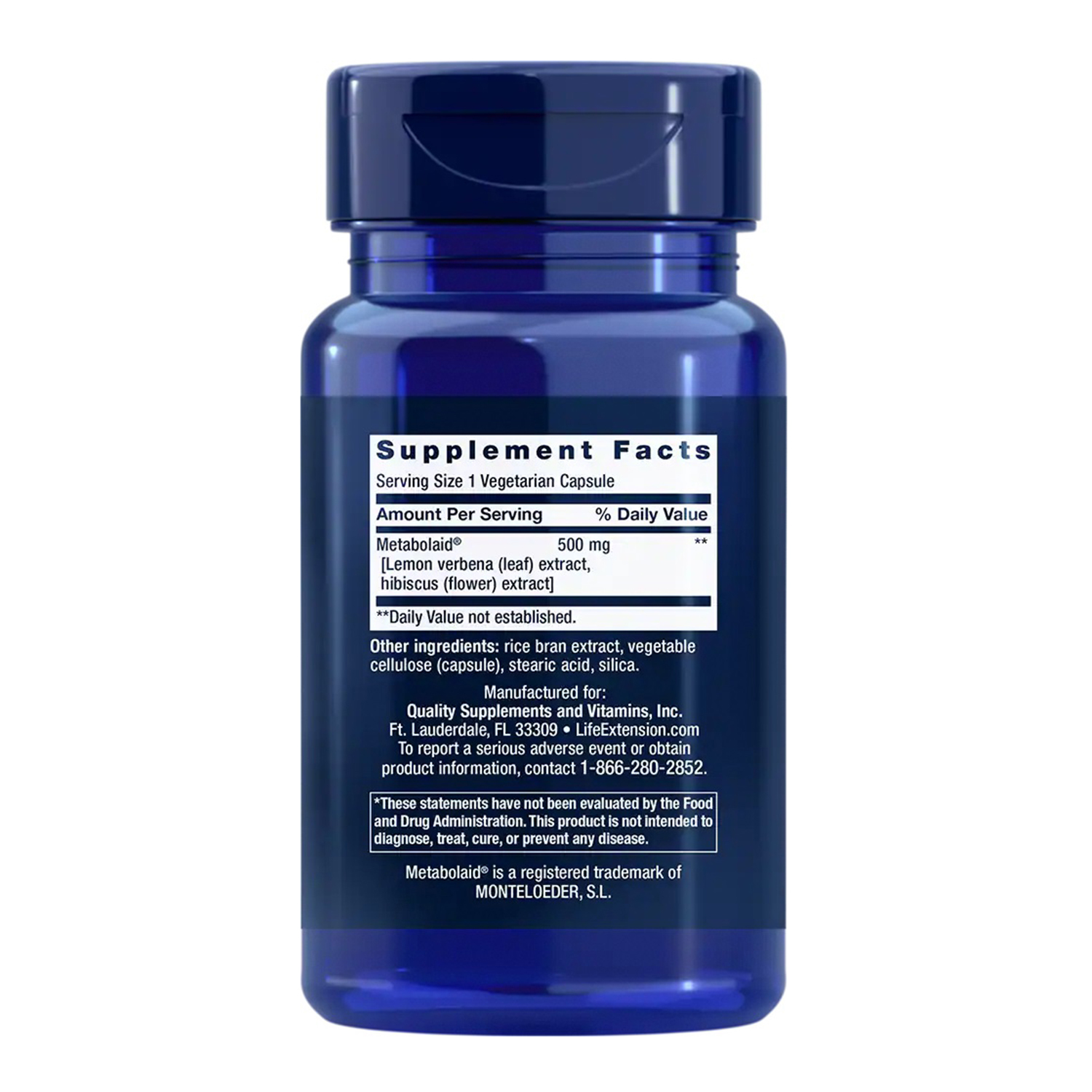 Metabolaid (Lemon verbena [leaf] extract, hibiscus [flower] extract). Other Ingredients: rice bran extract, vegetable cellulose (capsule), stearic acid, silica.