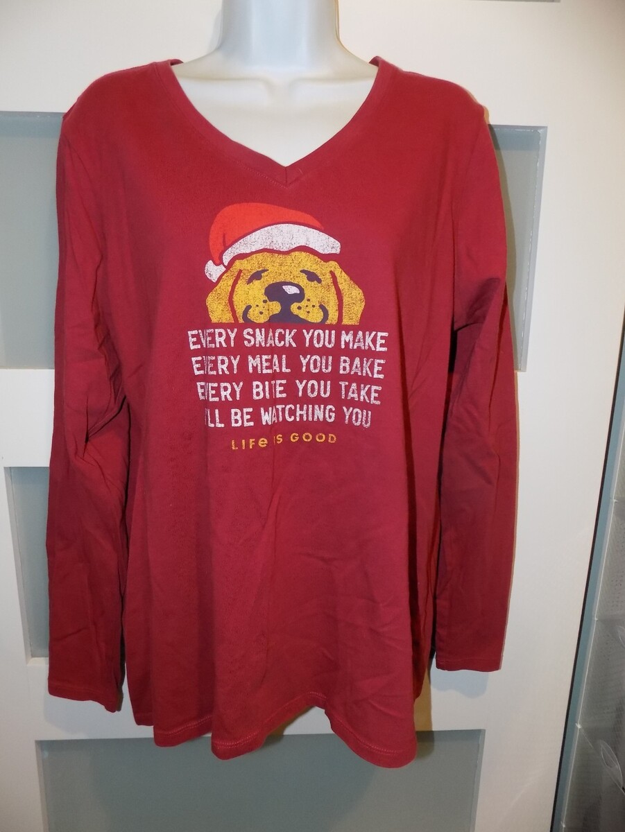 - Life is Good Red Crusher Tee V-Neck LS Santa Lab Shirt Size L Womens