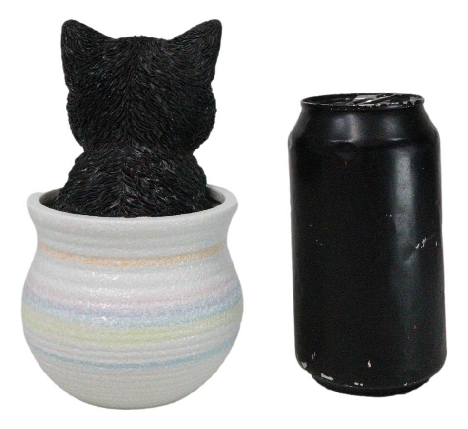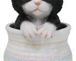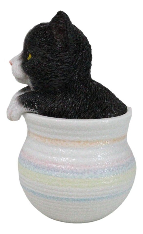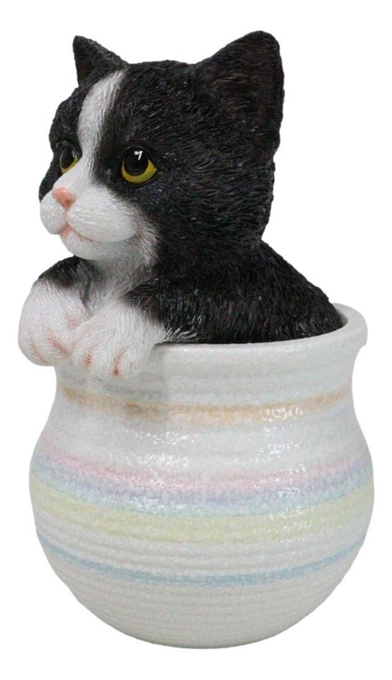 - Lifelike Black And White Tuxedo Cat In Pastel Artsy Pot With Glass Eyes Figurine