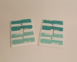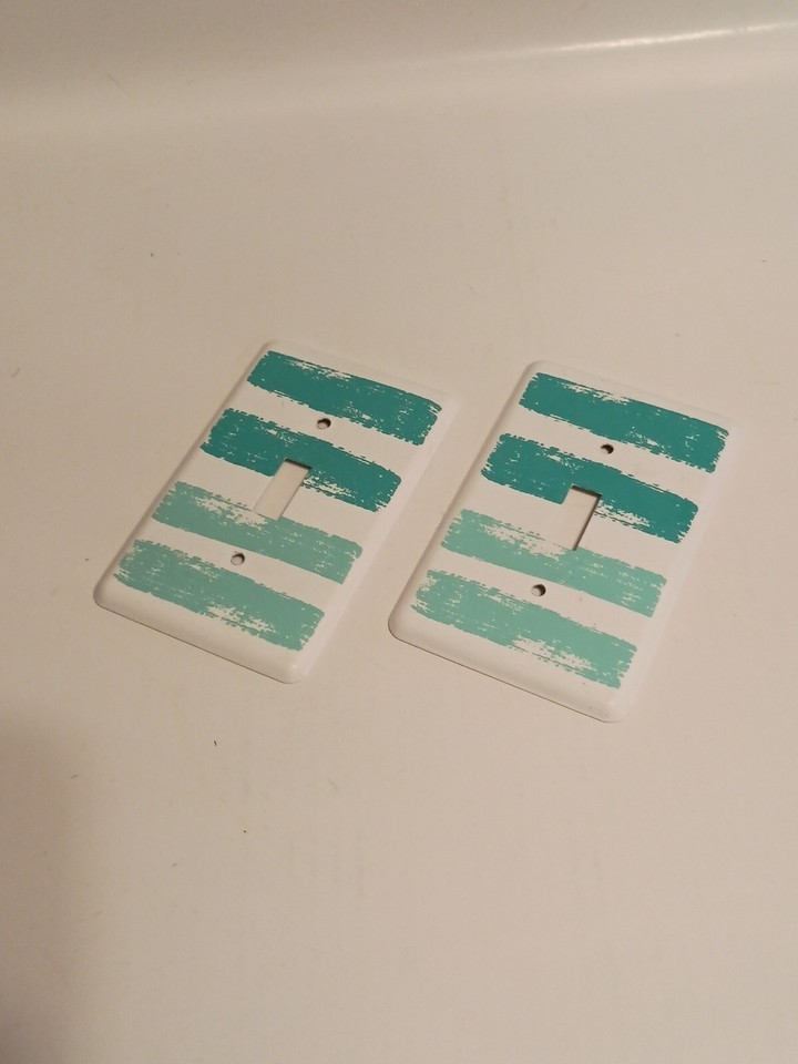 The 2 White And Teal Stripe Metal Light Switch Cover Wall Plates are modern wall decorations suitable for any room, such as a kids room, living room, or office. Made of metal, these multicolored wall plates feature a stylish white and teal stripe design, adding a touch of contemporary flair to your space. They are specifically designed for light switches and are easy to install on the wall, making them a practical and aesthetic addition to your home decor. This is a pre-owned item with normal wear. No screws, wall switch plates only.