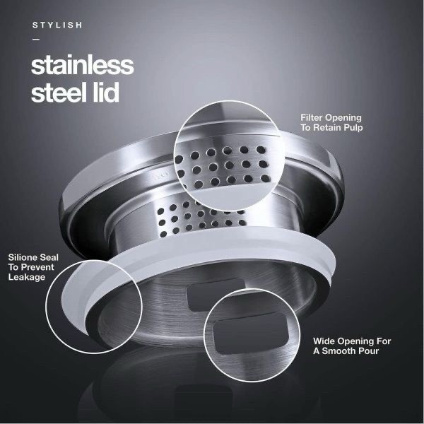 The stainless steel lid has a double filter which retains pulp and ice and allows a smooth pour and prevents leakage.