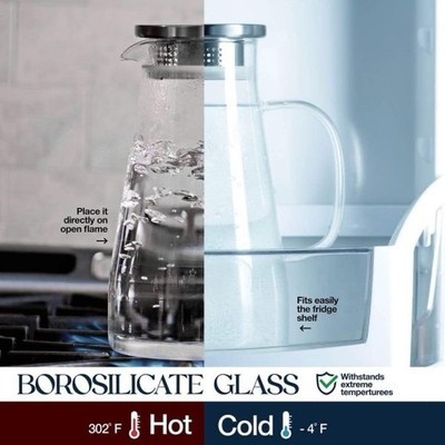Made of extra durable borosilicate glass, this pitcher can withstand extreme temperatures. It is not fridge and stovetop safe.