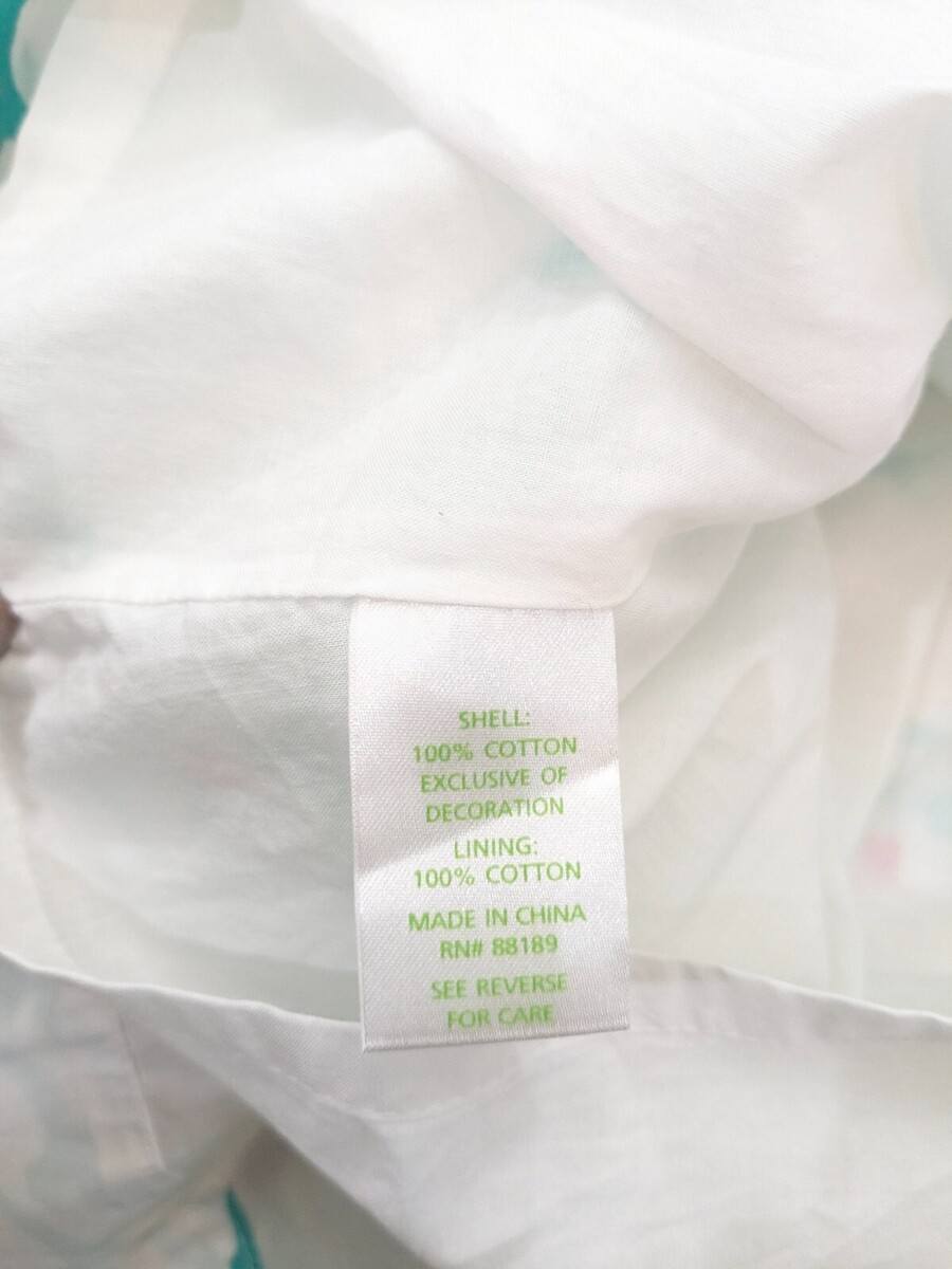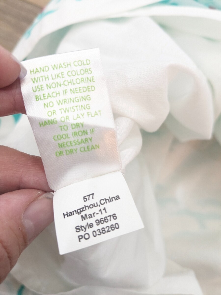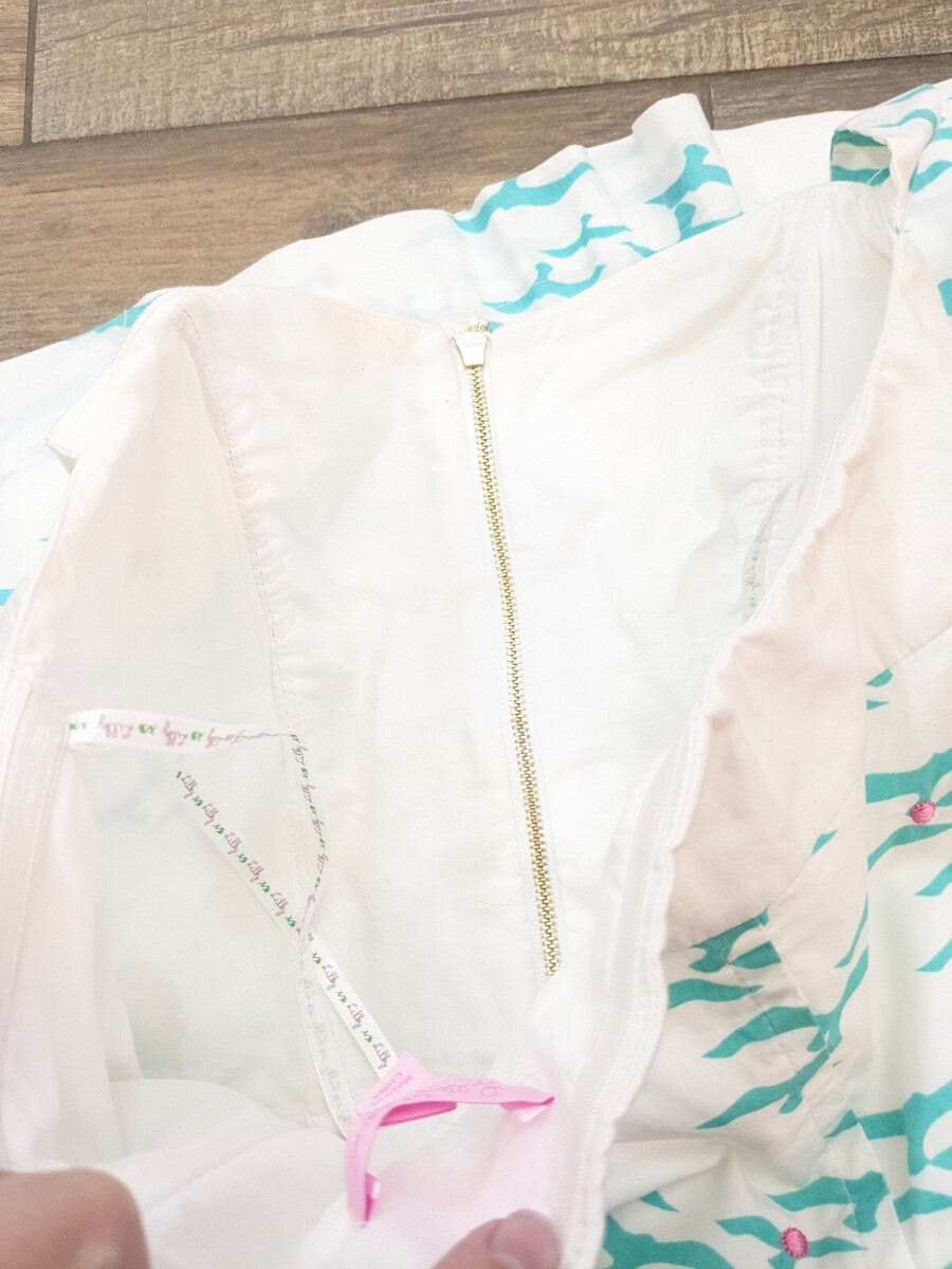 Very good condition. Seafoam green/teal with pink on white background. Gold zipper on front. Halter style with boning. See pics.