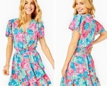 DETAILS: New with tags, Lilly Pulitzer fit flare dress. Maryanne stretch style. Surf blue, multicolor ?luscious lions? floral print. Woven, lileeze fabric. Short flutter Sleeve. V-neck, surplice. Faux wrap bodice. Smocked waist. Asymmetric Ruffled tier skirt. Pullover head to wear. Excellent dress for resort, party, date night, workwear, casual or any occasion.