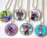 this is for 5 really cool metal material necklaces....24inch ball chain necklaces....vivid pictures, ...each has its own necklace, 5 complete.... each picture will be covered with a clear protective covering ...great your little ones will love them, individually packaged ready for the loot bag....SURE TO BE A HIT WITH EVERYONE