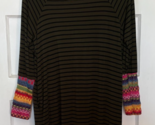 Lilypad Green Black Striped Dress with Vibrant Sleeves Size M. This piece can either be worn as a mini dress, or as a long tunic over leggings. Armpit to armpit measures 18?. Shoulder to hem is 30?. Raglan sleeves are approximately 23?. 95% Rayon and 5% Spandex. Made in the USA. Hand Wash. Very Good Used Condition - See Photos for further description.