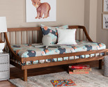 Features: Constructed from rubberwood, MDF wood, and LVL Walnut brown finish Spindle Design Sloping Arms Wood Slats Eliminate the Need for a Box Spring Rounded Legs Set Includes: One (1) Twin Size Daybed