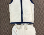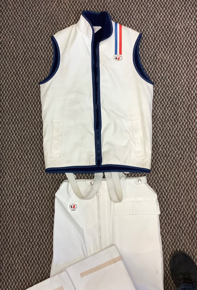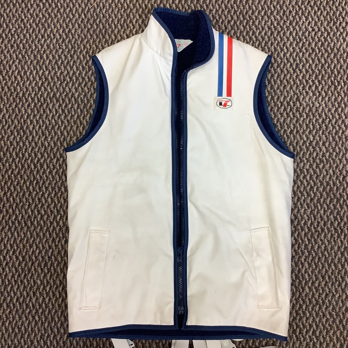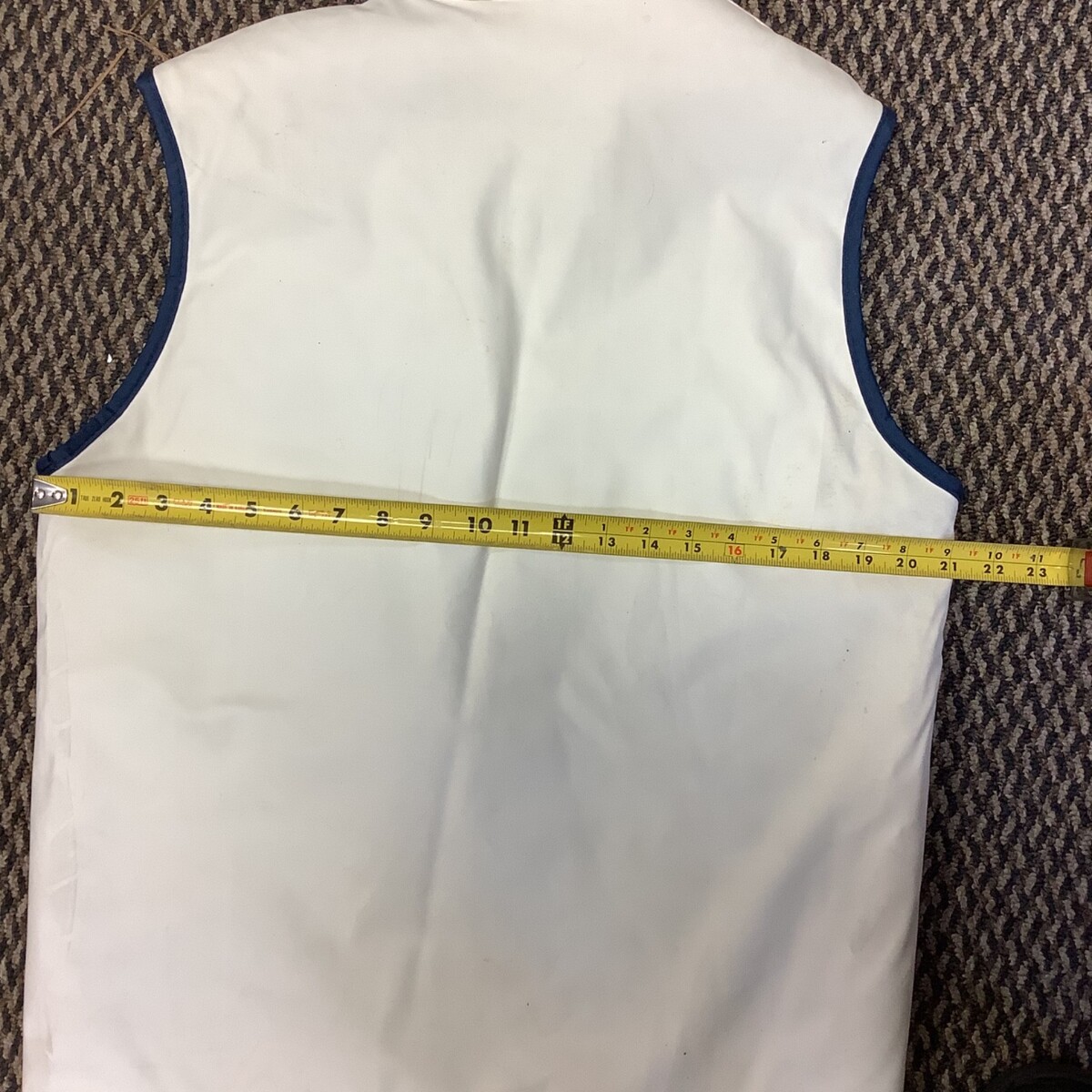Line 7 Seven Sailing Racing Gear White PVC Coated L Vest Pants Suit Waterproof. Really nice set of white sailing vest and pants. They may be over pants I?m not sure. They could use a little cleaning, but I believe these may be vintage, so they are an overall good condition for their age. The vest is lined. Please see all photos. Photos include measurements for armpit to armpit and for top of shoulder to bottom of vest. And photos include measurements on the pants for the waist down to the bottom of the cuff and for the crotch seam down to the bottom of the cuff. Photos also include labels on both pants and the vest to show size in measurements.