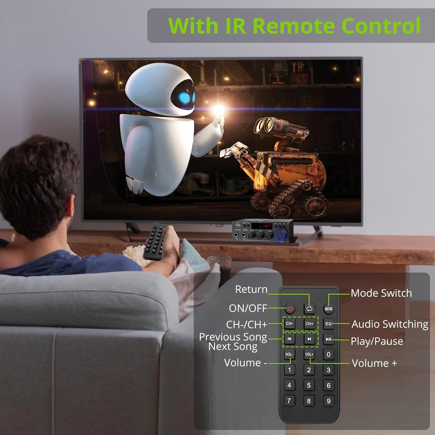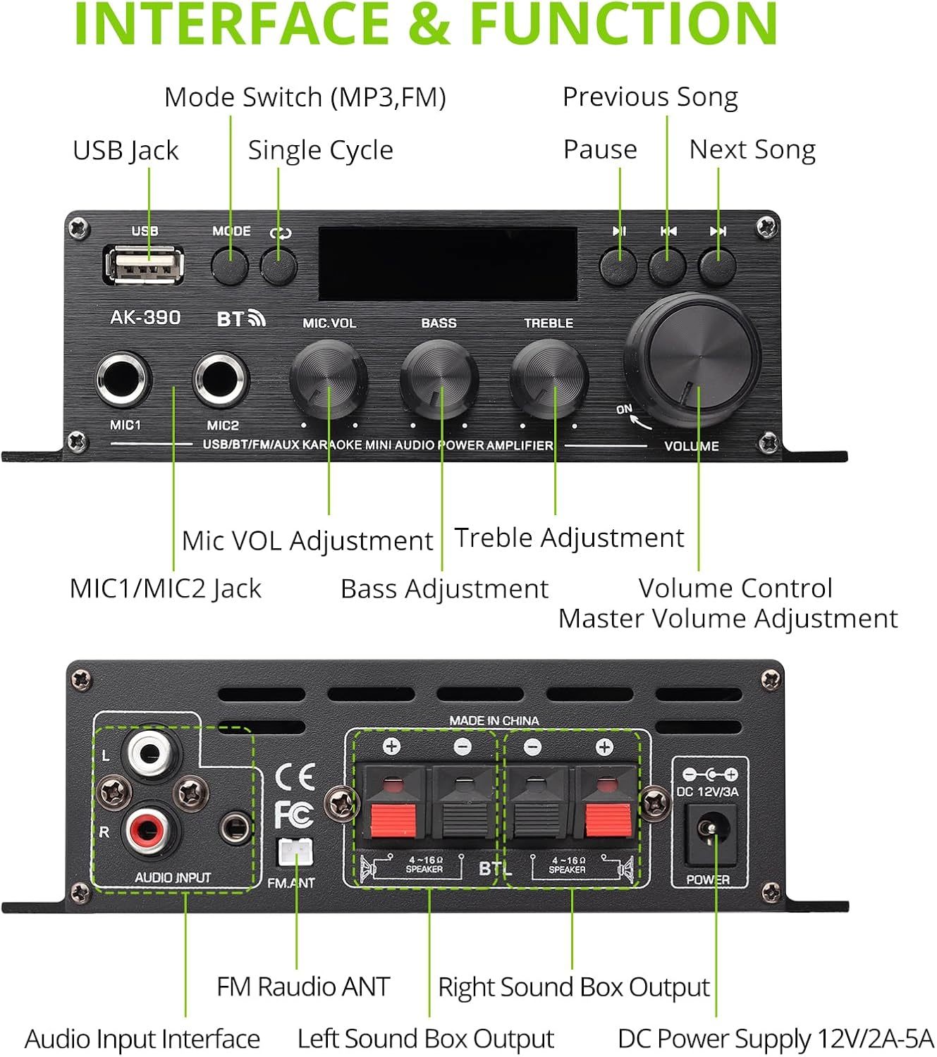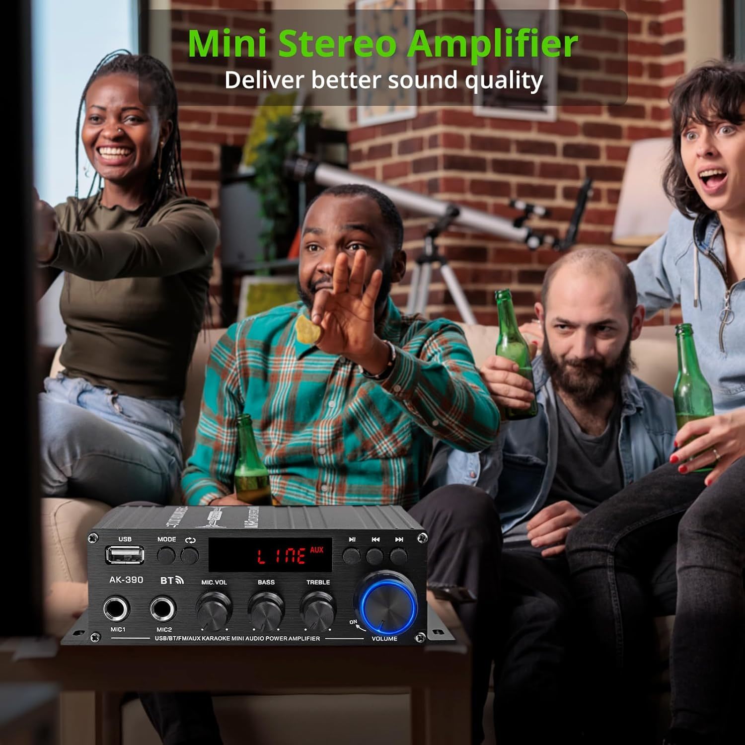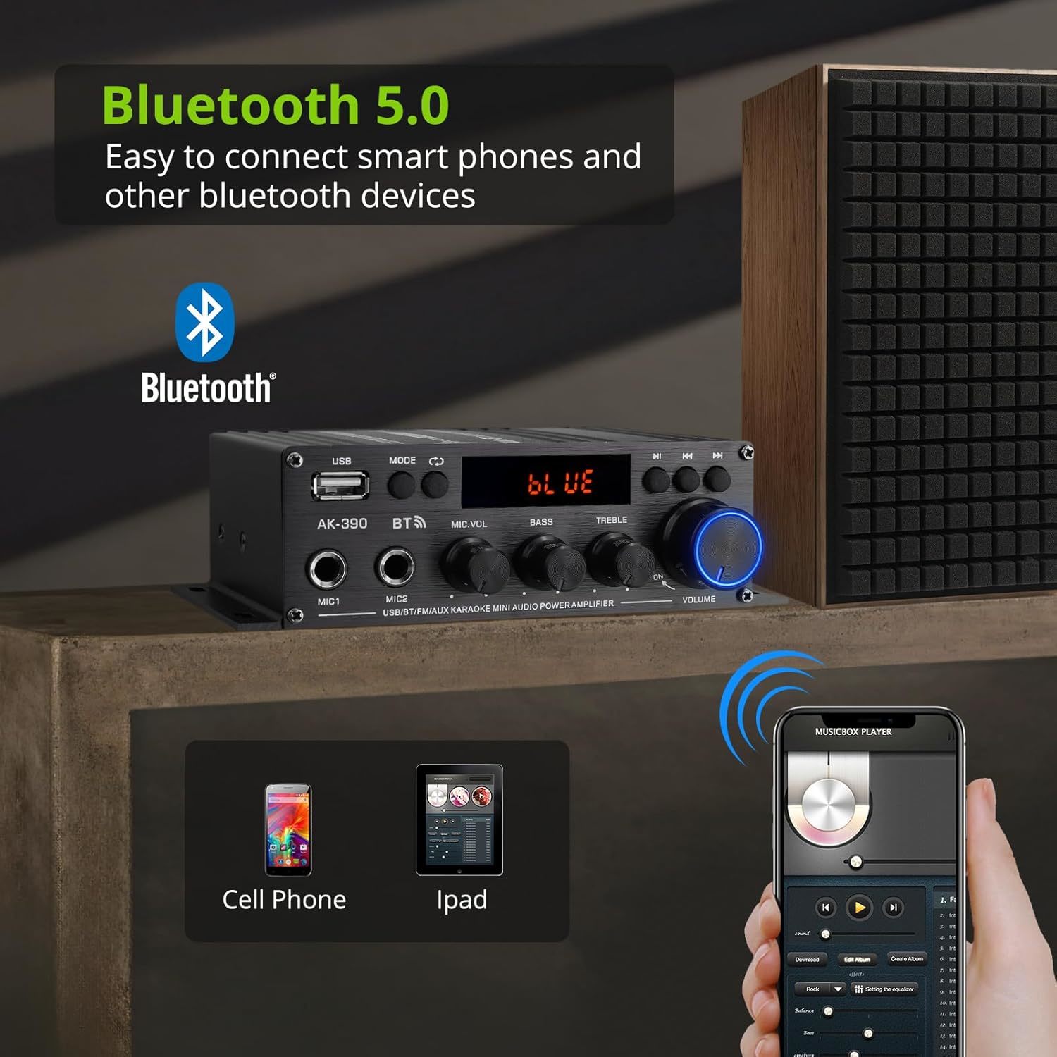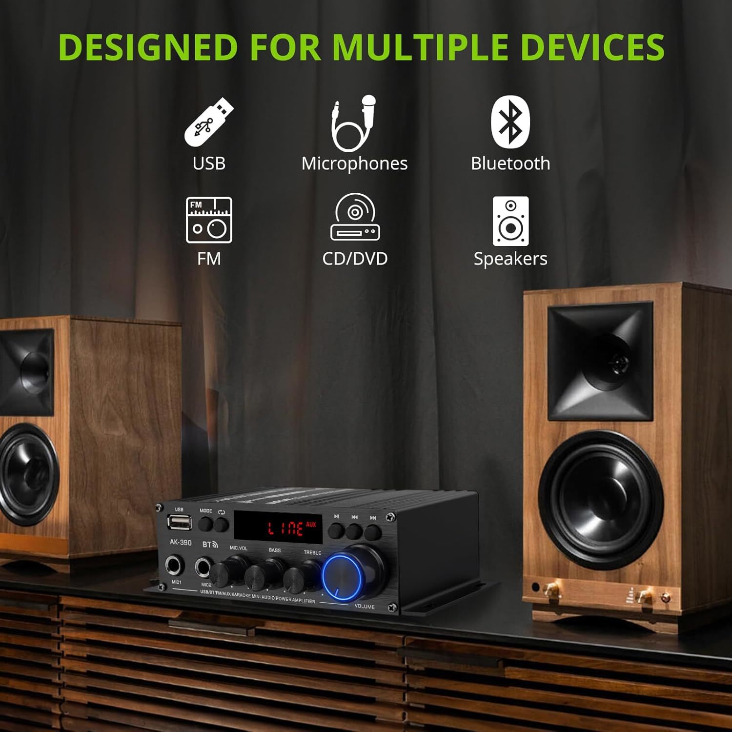 BLUETOOTH CONNECTIVITY: Stream high quality audio wirelessly from any Bluetooth enabled device with easy pairing and stable signal up to 30 feet. MULTIFUNCTIONAL DESIGN: Equipped with LCD display, dual channel stereo amplifier, various audio inputs and microphone jack for karaoke, this unit supports multi usage scenarios. POWERFUL PERFORMANCE: 40W x 2 power output is enough to drive most bookshelf or floor standing speakers for whole home audio with deep bass and clear highs. USER FRIENDLY CONTROL: Front panel buttons allow adjusting volume, switching sources and more with intuitive operation while built-in power supply ensures stable output. UNIVERSAL COMPATIBILITY: Compatible with most audio devices through Bluetooth, AUX, Coaxial and Optical inputs. It's the ideal choice for upgrading old stereo systems or building new setups.