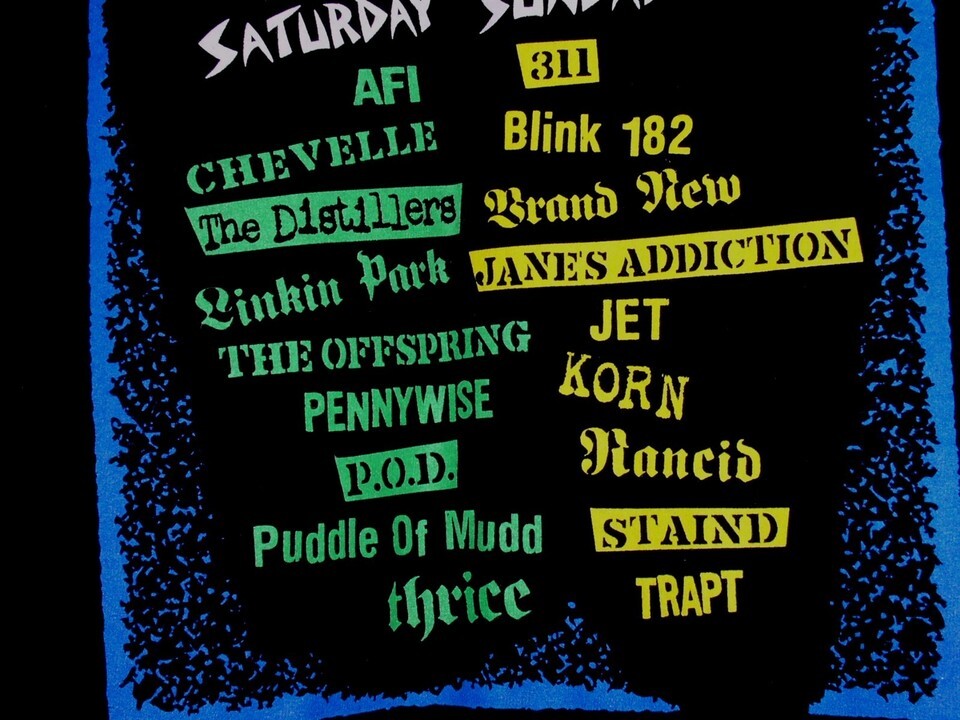 Acts listed on the back for both days are: AFI, Chevelle, the Distillers, Linkin Park, The Offspring, Pennywise, P.O.D., Puddle Of Mudd, Thrice, 311, Blink 182, Brand New, Jane's Addiction, Jet, Korn, Rancid, Staind, Trapt.