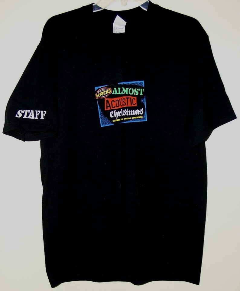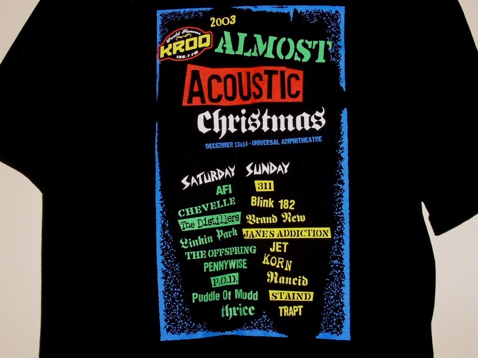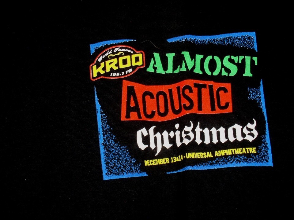 This is a vintage concert tour t shirt entitled, "2003 KROQ Almost Acoustic Christmas December 13 14, Universal Amphitheatre". Tag reads: Fruit of the Loom Lofteez. A terrific item for the fan or collector.
