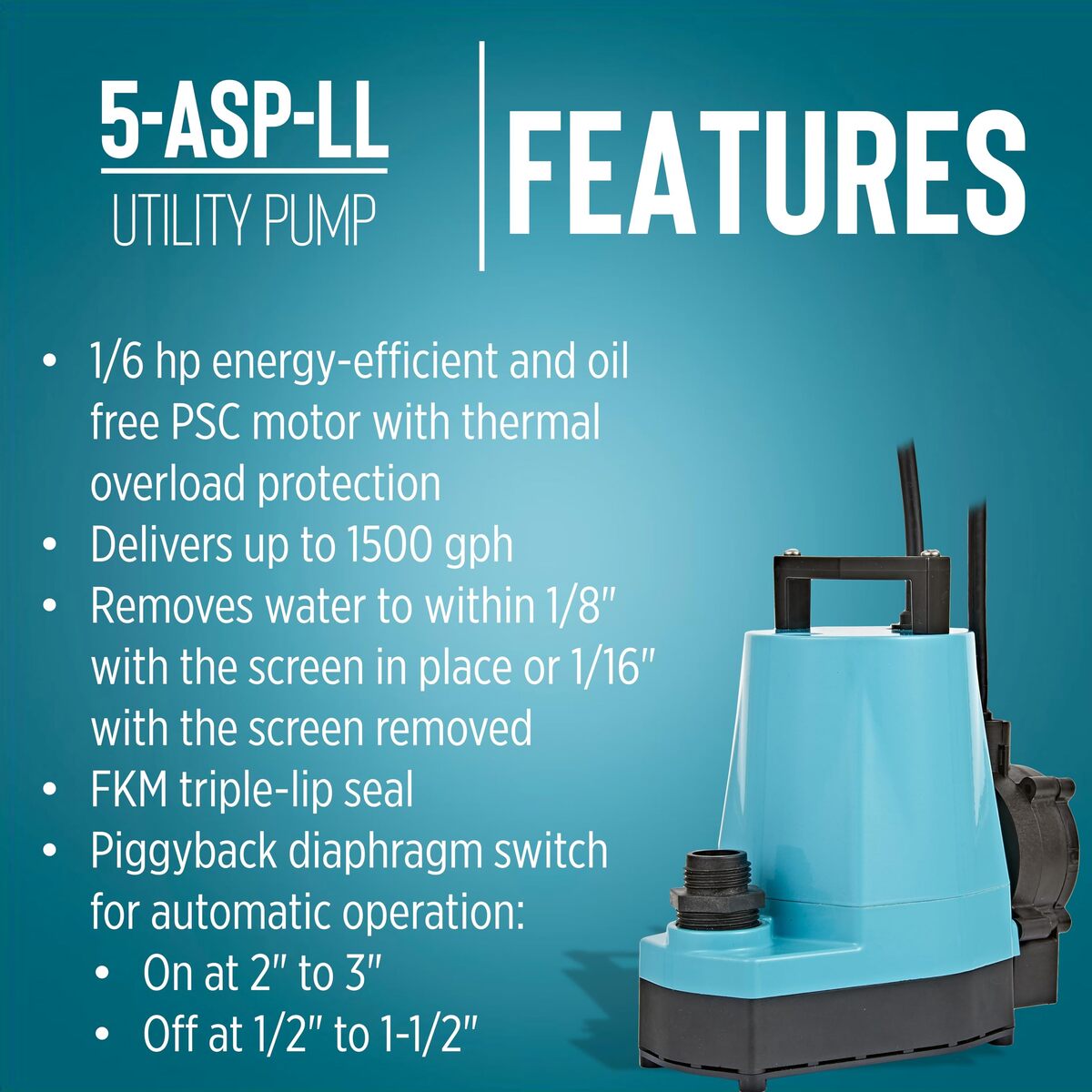 The Little Giant continuous duty submersible 1/6 HP 5-MSP manual utility pump is ideal for commercial, industrial, or home uses for transferring or recirculating water. It has a removable screen and removes water down to 1/8-inch with screen or 1/16-inch without screen. The 5-MSP is an excellent choice for flood water removal, hydroponics, or a water transfer pump in and around the home. This pump is 115-Volts and is equipped with a 10-Ft. cord. A 3/4-inch garden hose adapter is included.