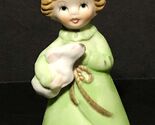 - Little Girl Green Dress Porcelain BELL Bow In Hair Holding Rabbit Bunny 4”