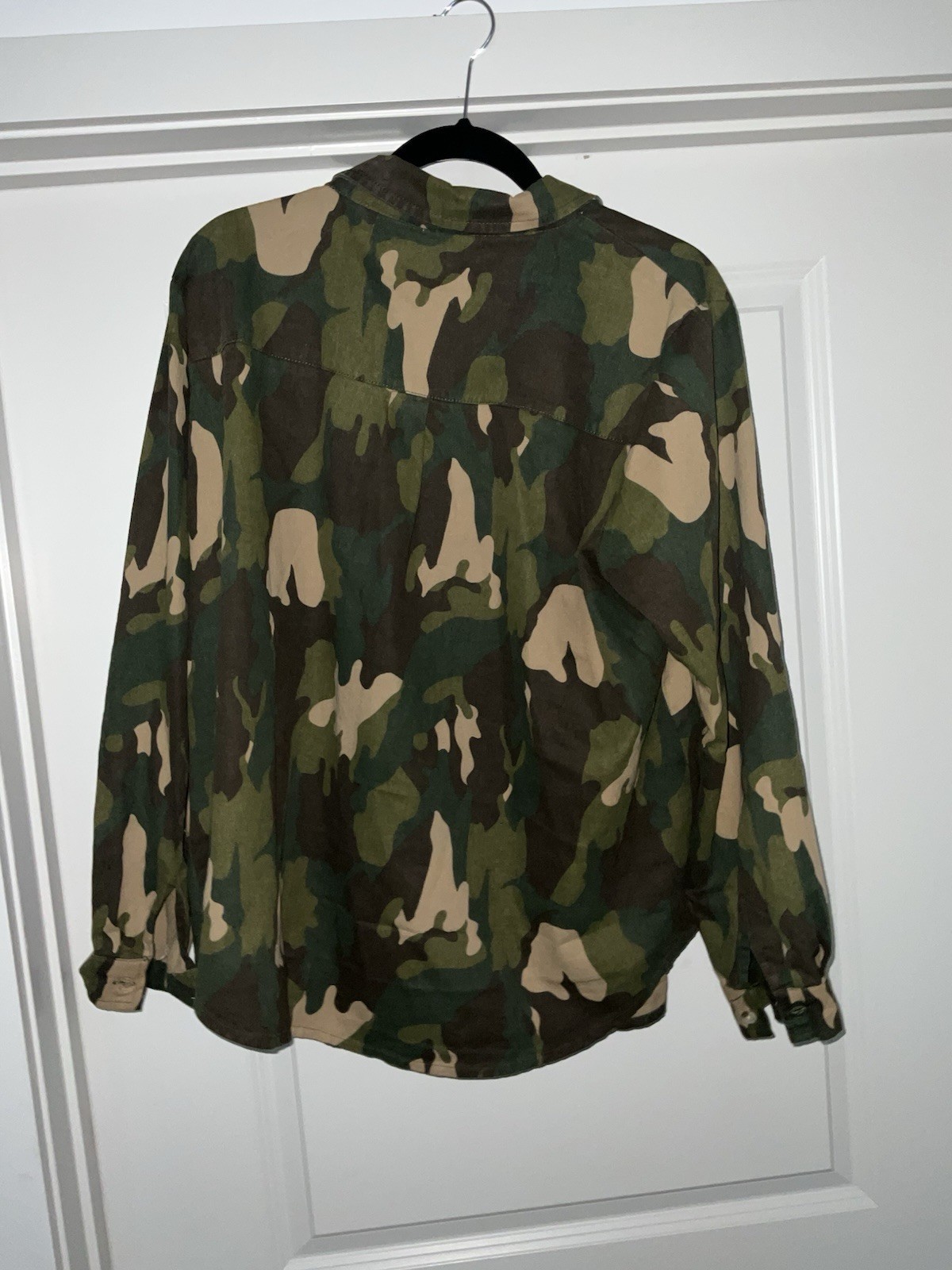 The Live 4 Truth Green 100% Army Print Button Front Long Sleeve Shirt in size XL is a stylish and comfortable top for women. With a camouflage pattern featuring a military theme, this oversized shirt is perfect for those who want to make a statement with their fashion. The long sleeves and button-up front add a touch of sophistication, making it a versatile piece that can be dressed up or down. Ideal for casual wear or as a trendy wardrobe staple, this shirt is sure to stand out in any outfit. **1 button missing**