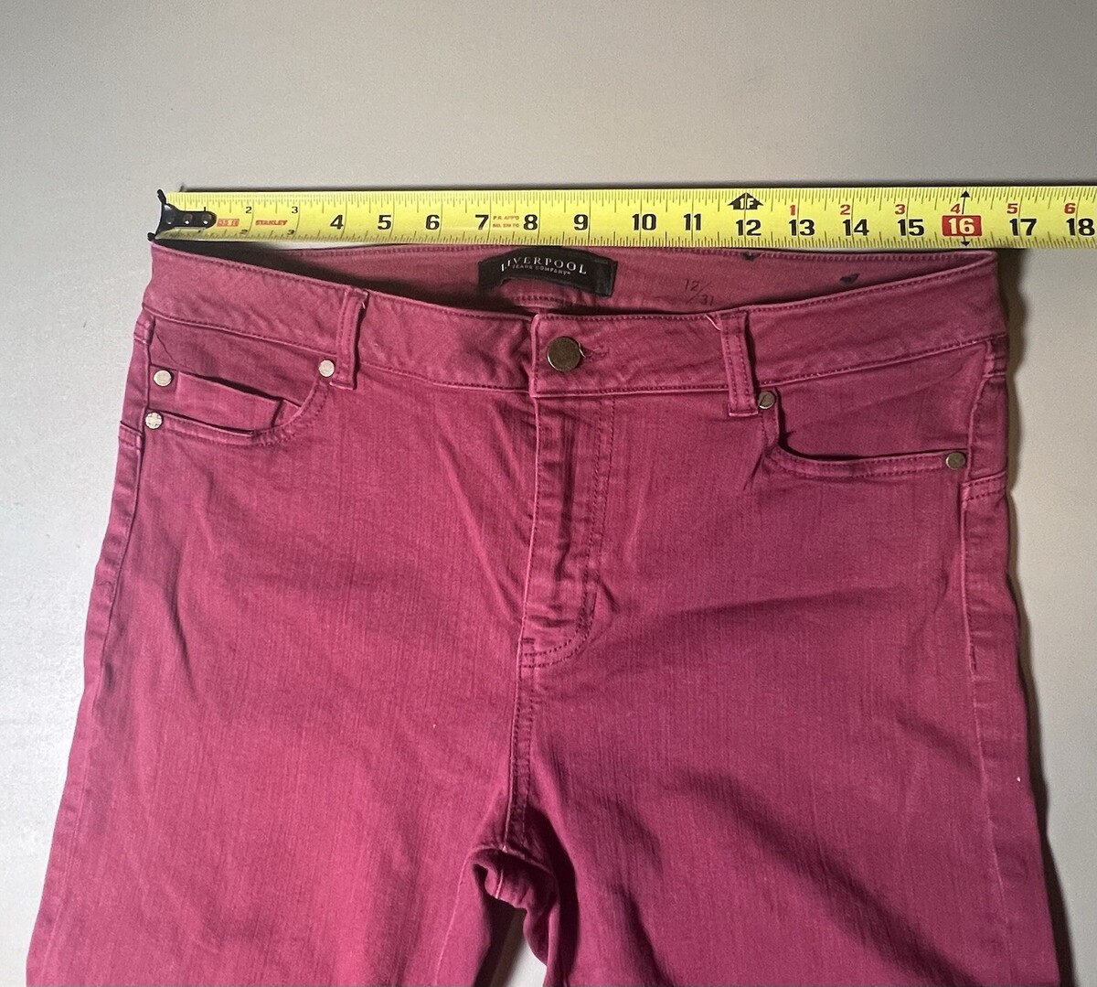 The Liverpool Jeans Company The Skinny Women's 12/31 in red is a stylish pair of women's jeans in a size 12. With a sleek skinny style, these red jeans from Liverpool are designed to fit and flatter the female figure. Perfect for a casual and chic look, these jeans are a versatile addition to any wardrobe.