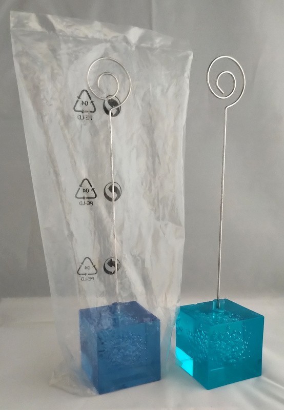 Tabletop holders in blue and turquoise each measure approximately 9" tall x 2" square. Curved silver holders hold one photo or card.