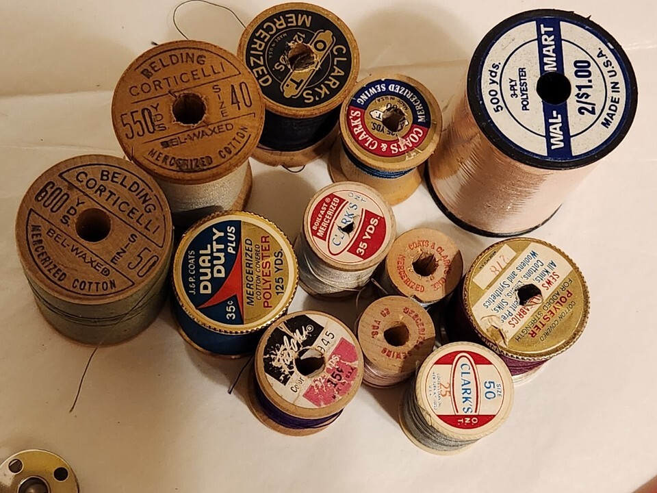 - Lot 21 Corticelli Coats Antique Vintage Sewing Thread Wood Spools Metal Bobbins