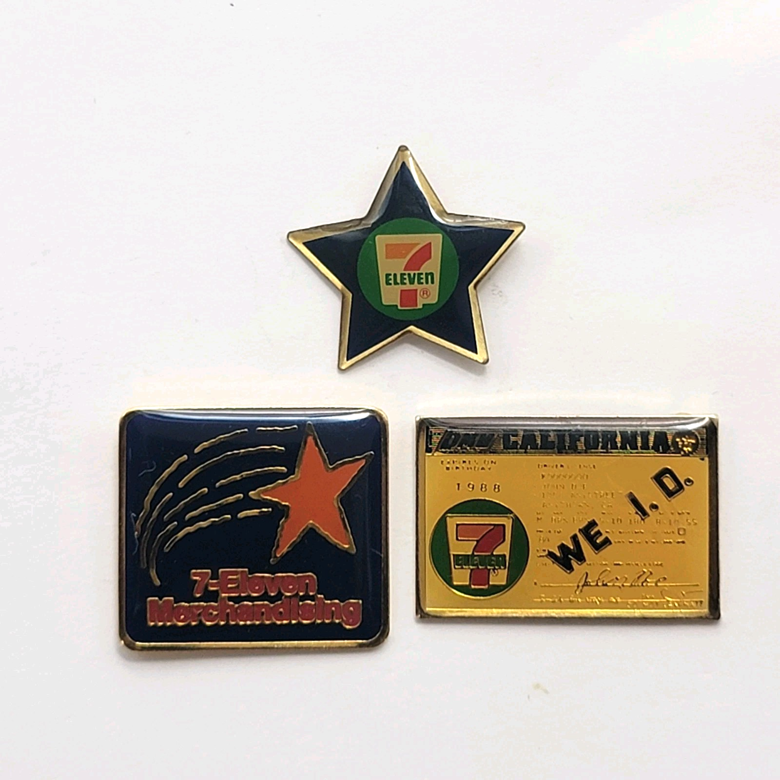 - Lot 3 Vintage 7-Eleven Pins Merchandising We I.D. Employee Logo Star Advertising