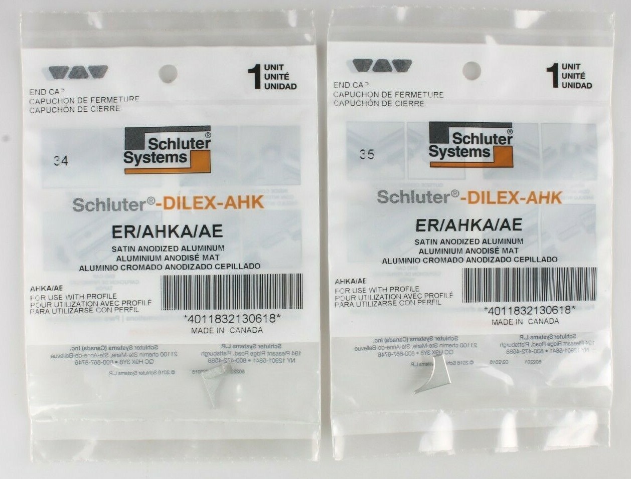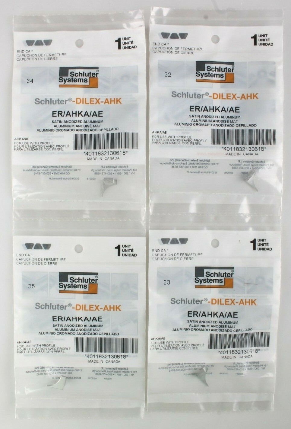 This is for a lot of Four (4) Schluter Systems ER/AHKA/AE DILEX-AHK Right Side Aluminum End Caps In factory sealed plastic bags The ER/AHKA/AE is a right end cap for the Dilex-AHKA cove-shaped profile. It is used to cover the open edge of the profile in applications where the end is right exposed. The end cap has a leg that fits into the profile and can be used with any size of the Dilex-AHKA in satin anodized aluminum. Made of satin anodized aluminum For use with Dilex-AHKA cove-shaped profile Size: 1/4 in. x 1/2 in. Finish: Satin Aluminum Right end cap Finishes the exposed profile edge Easily fits into profile for quick installation