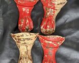 A vendre est un ensemble de 4 pieds de boule a griffes de baignoire en fonte de recuperation architecturale d'occasion qui ont ete peints en rouge et blanc avec de la peinture ecaillee qui mesure 6 pouces de hauteur.