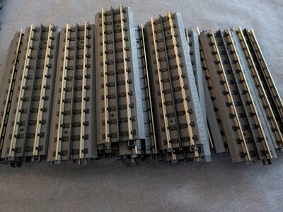 Le produit est un lot de 56 voies a voie O pour train electrique Rail King MTH, comprenant des pieces courbes longues et courtes, ainsi que des voies droites de 10 pouces. Ces voies sont constituees d'un systeme a trois rails de couleur grise et en matiere plastique. Le systeme de controle est analogique et ils sont prets a etre utilises. La marque est MTH et l'ecartement est O. Ces voies conviennent aux trains miniatures et aux trains et constituent un choix populaire pour les amateurs et les collectionneurs. Quantite: 8 longues courbes 8 Courts Courbes 40 10 en droit