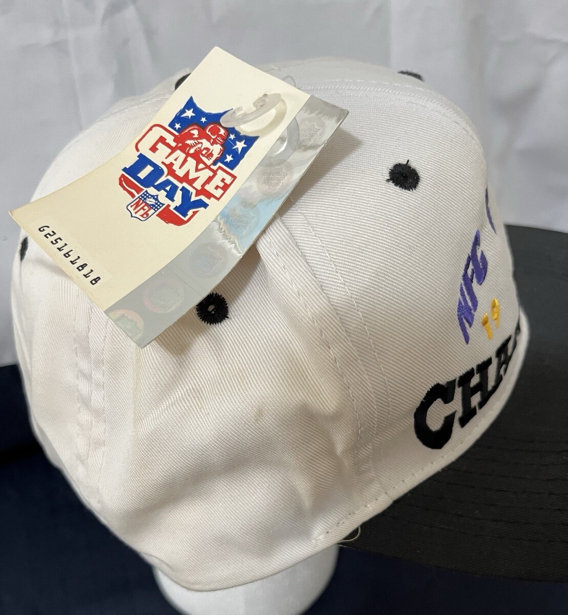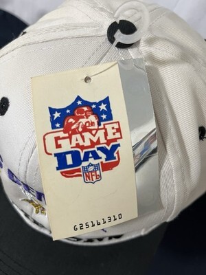 The product is a set of two Minnesota Vikings hats by Drew Pearson, officially licensed by the National Football League (NFL). These ivory caps are adjustable in size and suitable for both men and women adults. Made in China, they commemorate the 1998 playoffs season as Division Champions, making them a must-have for any football fan looking to show their support for the Minnesota Vikings. Both Hats Show Some Faint Storage Dust and a Few Minor Spots. These 27 Year Old Caps Are Never Worn and New With Tags.