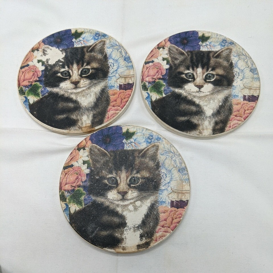 Lot Of (3) Vintage Cat Coaster Stone Coasters