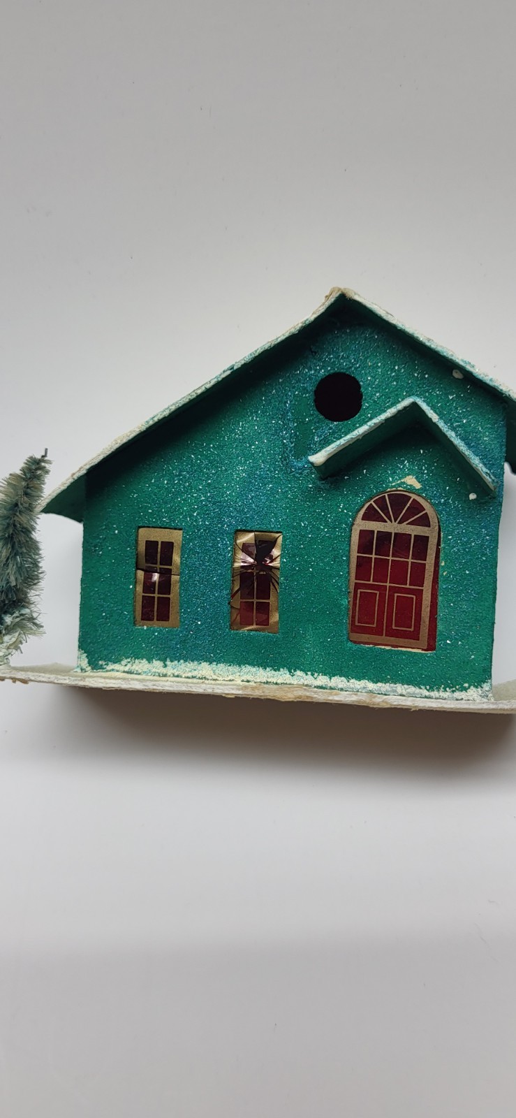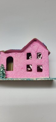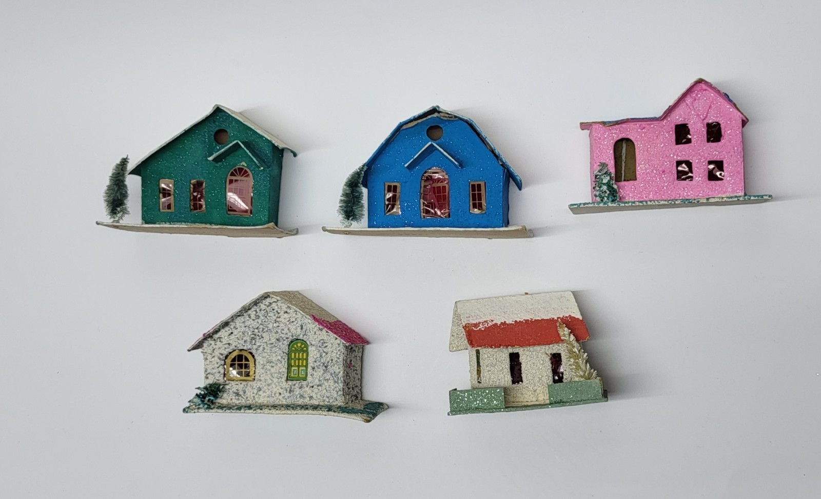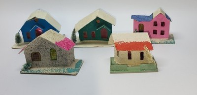 - LOT OF 5 VINTAGE PUTZ CHRISTMAS VILLAGE CARDBOARD HOUSE GLITTER JAPAN