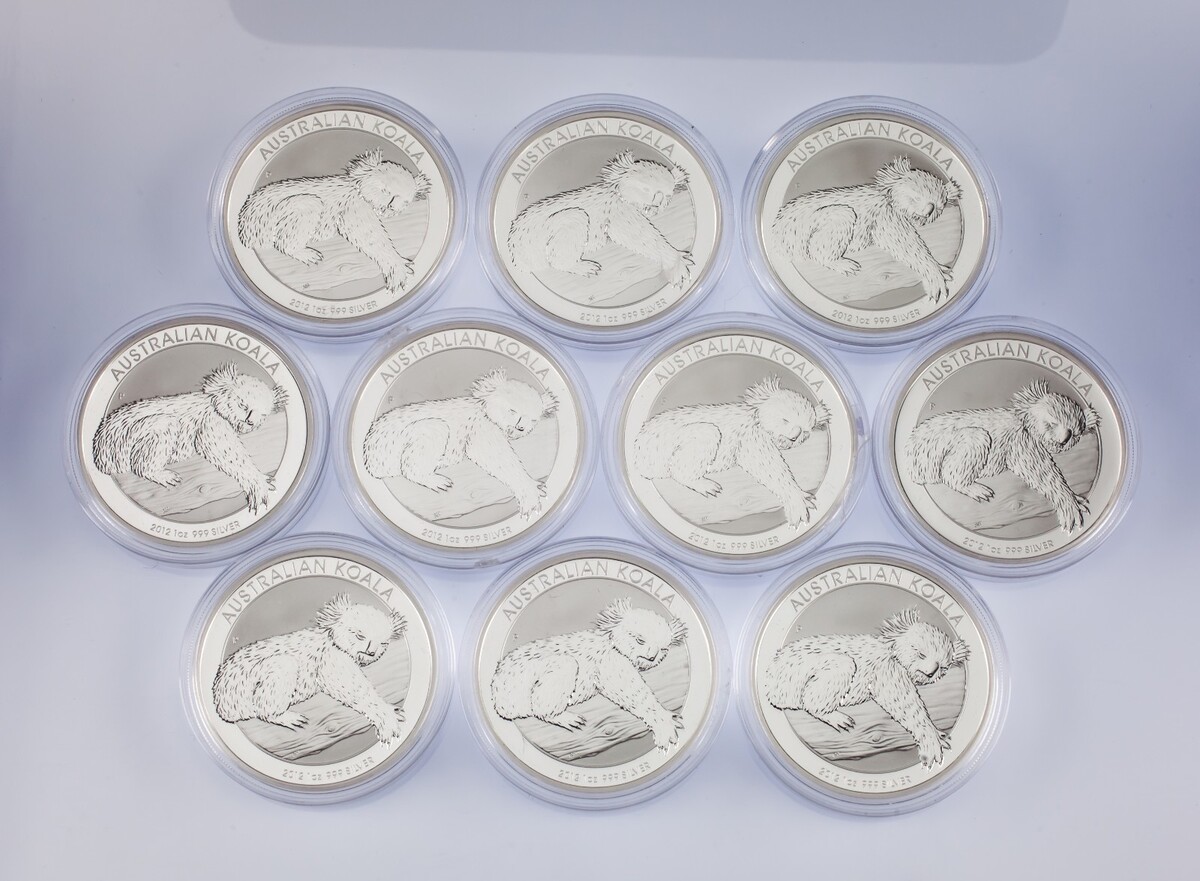 - Lot of 10 2012 Australia Silver 1oz Koala (BU Condition) in Capsules KM# 1840