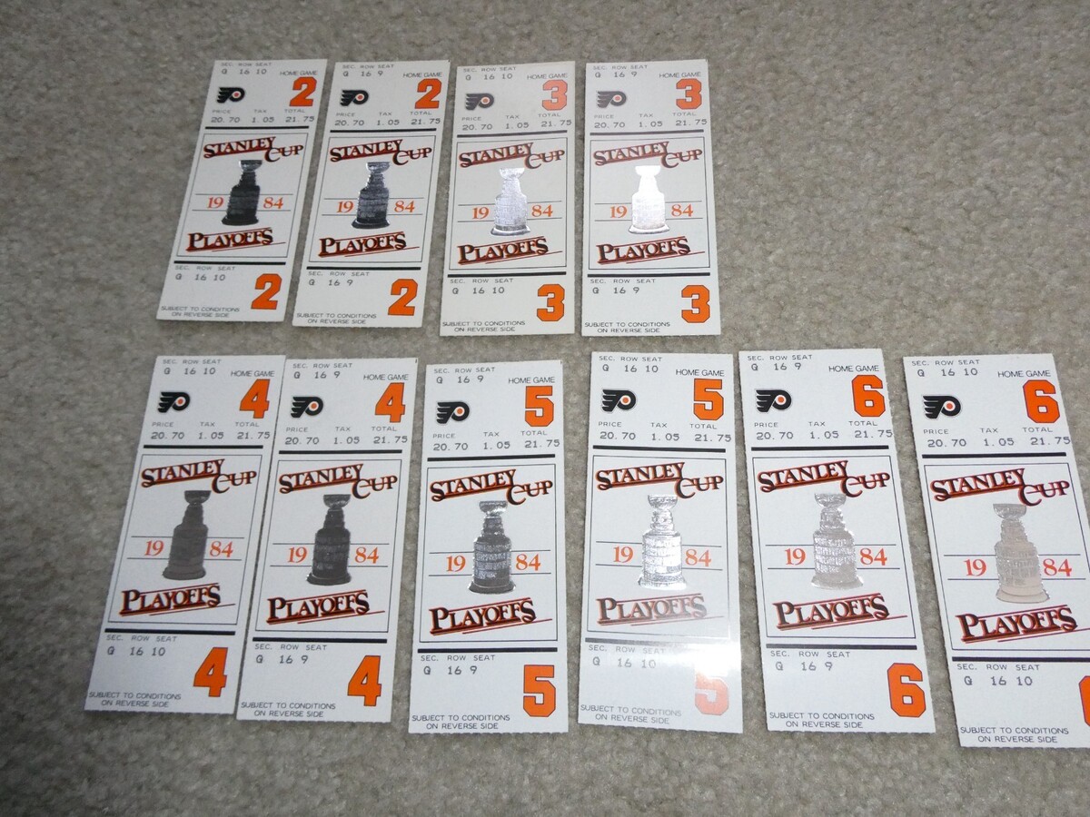 are bidding on a nice, original lot of 10 of the 1984 Stanley Cup Playoffs ticket stubs for the Philadelphia Flyers, in the pictures. Several different games as shown. Very nice shape, little wear as shown. Zoom in for condition.