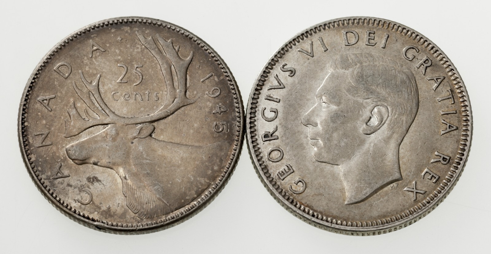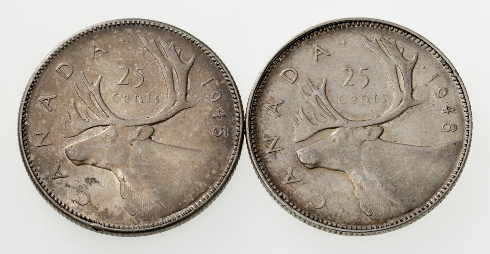 - Lot of 2 Canada 25 Cents coins (1945 25C AU and 1948 25C au) KM 35, 44