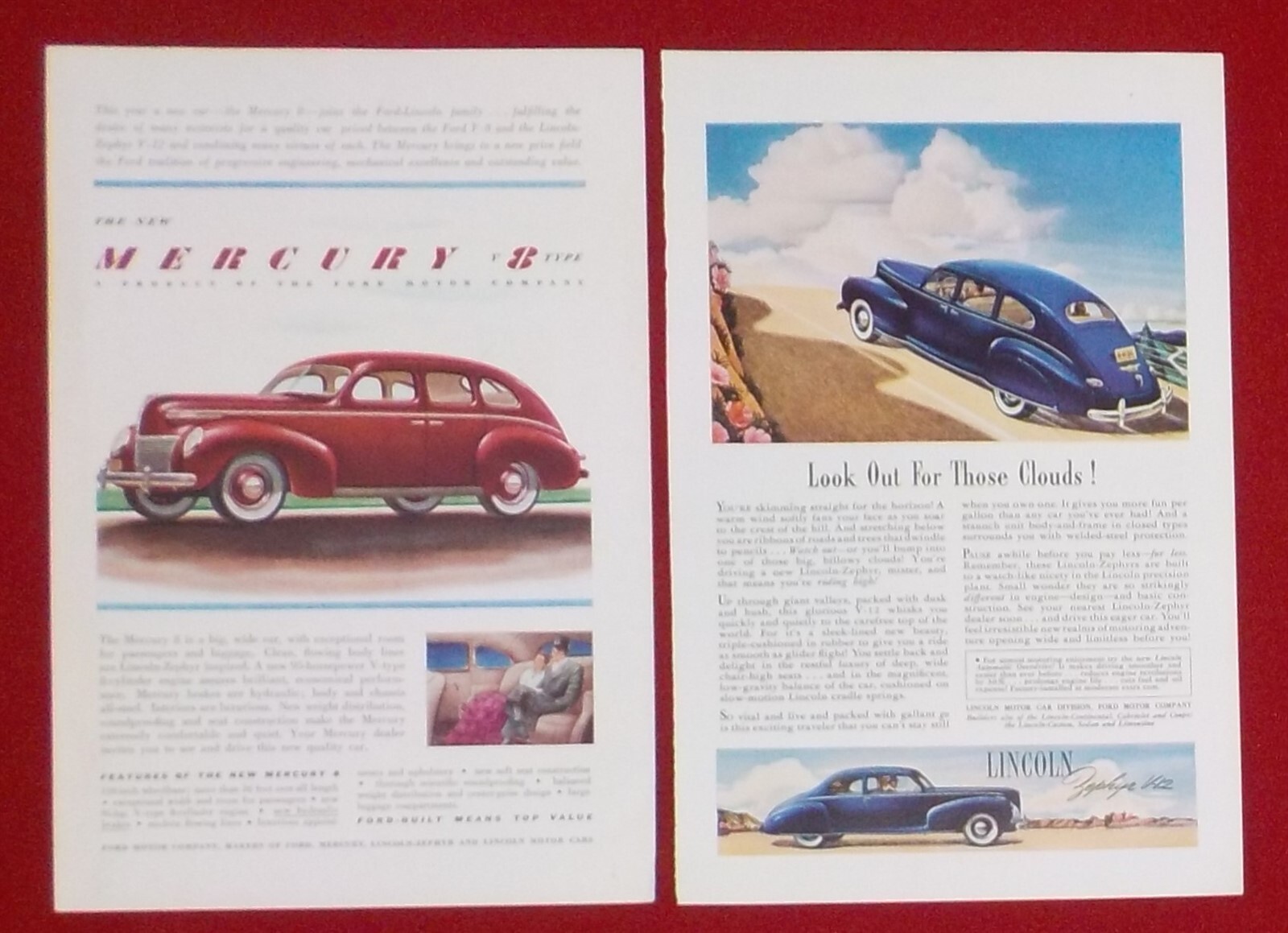 Lot of 2 Color Magazine Car / Automobile Print Ads 1939 MERCURY, 1941 LINCOLN A1