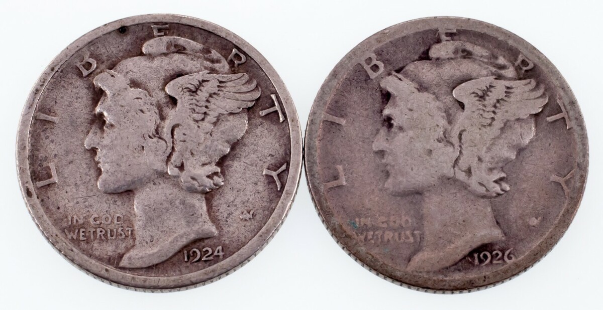 Lot of 2 Mercury Dimes (1924-S and 1926-S) in F - VF Condition, Natural Color