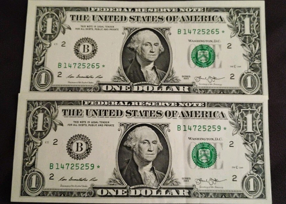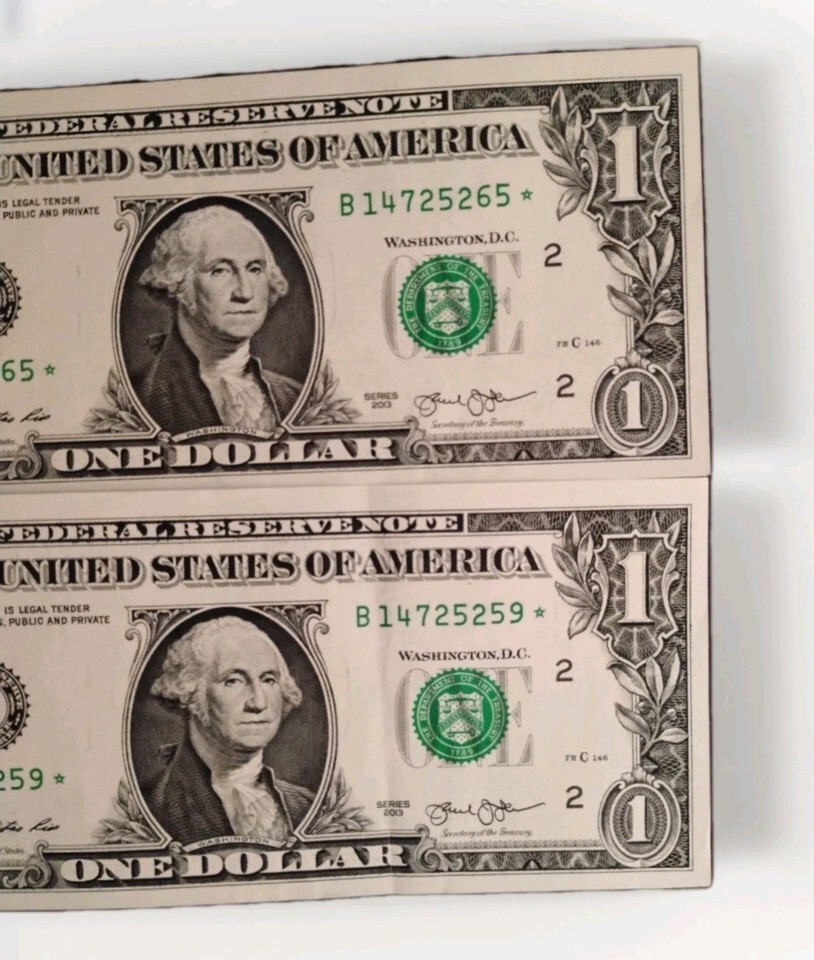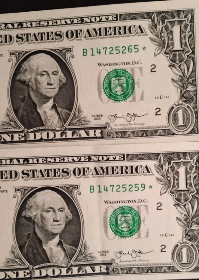 - Lot of 2) UNC Consecutive $1 B Series 2013 Dollar Star Note ⭐ Low SERIAL NUMBER