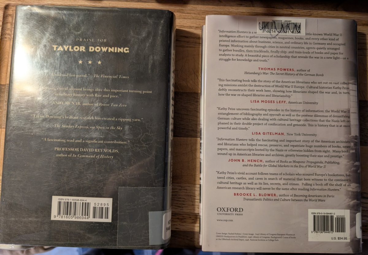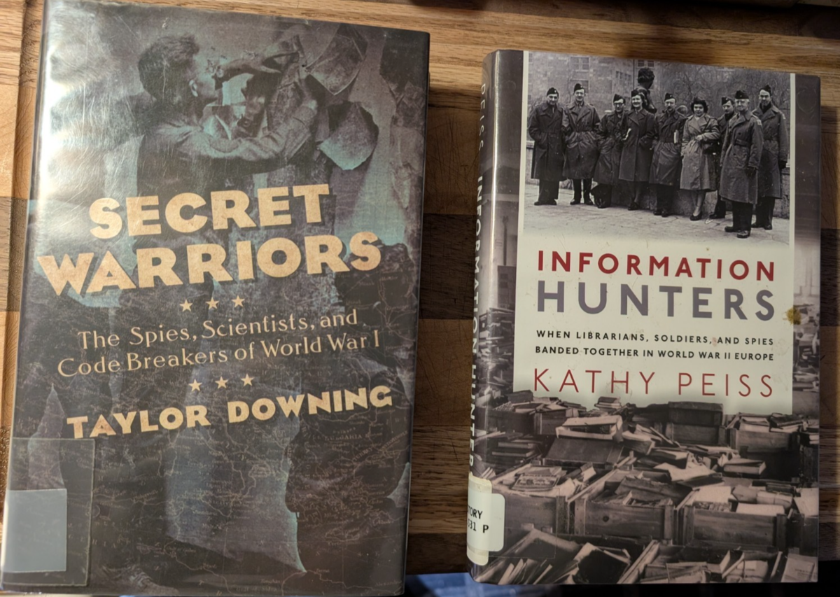 WWI history, WWII history, military intelligence, wartime espionage, codebreakers, cultural heritage, spy history books, Secret Warriors Taylor Downing, Information Hunters Kathy Peiss, military archival history, librarians in wartime, true espionage stories, hardcover book lot.