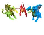 Lot of 3 Greenbrier International fantasy dragon toy figures featuring bold colors and detailed sculpting. Includes a red, green, and blue dragon with fire-breathing effects and dramatic poses. Each measures about 5? long and 2.5? tall ? perfect for collectors, fantasy enthusiasts, or anyone who appreciates detailed display toys.