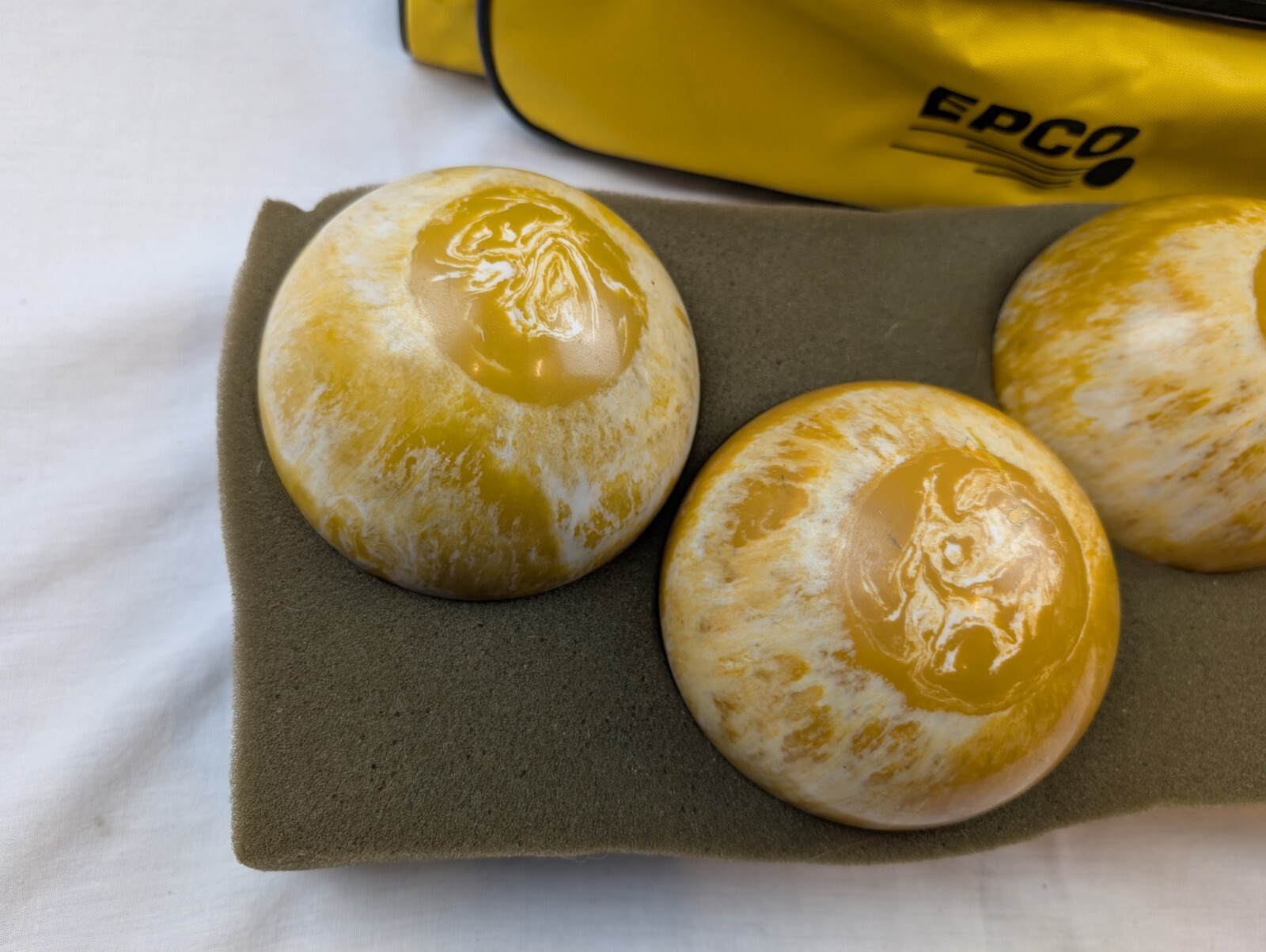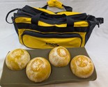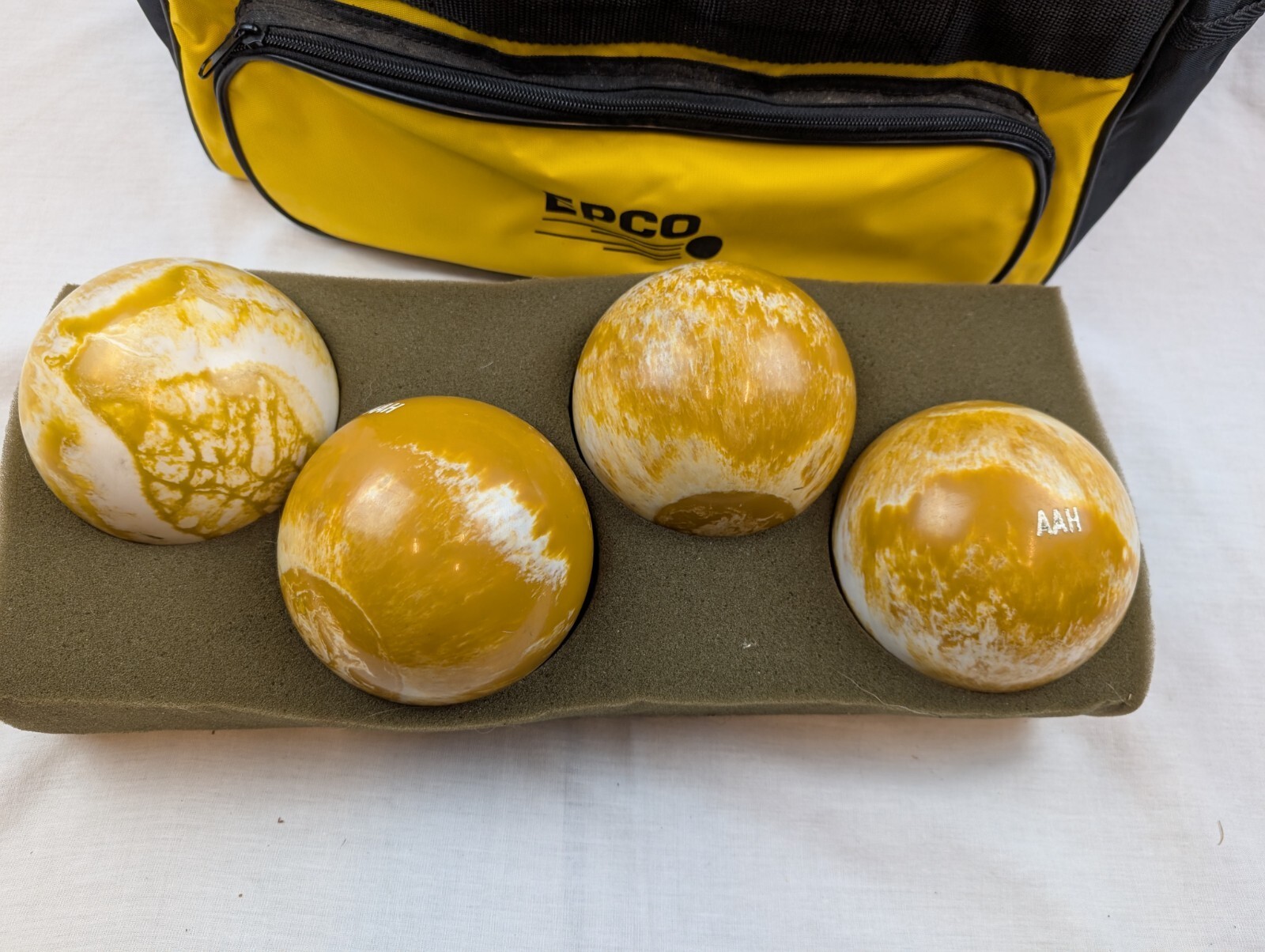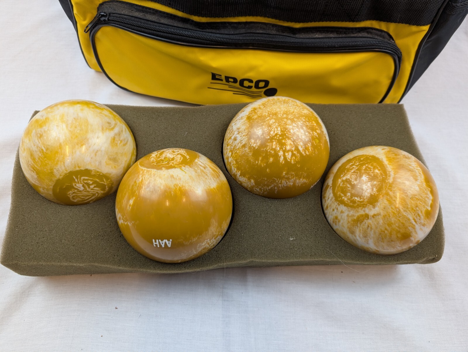 Up for sale is a Lot of 4 Candlepin Balls Epco Paramount Caramel/white swirl yellow carry bag