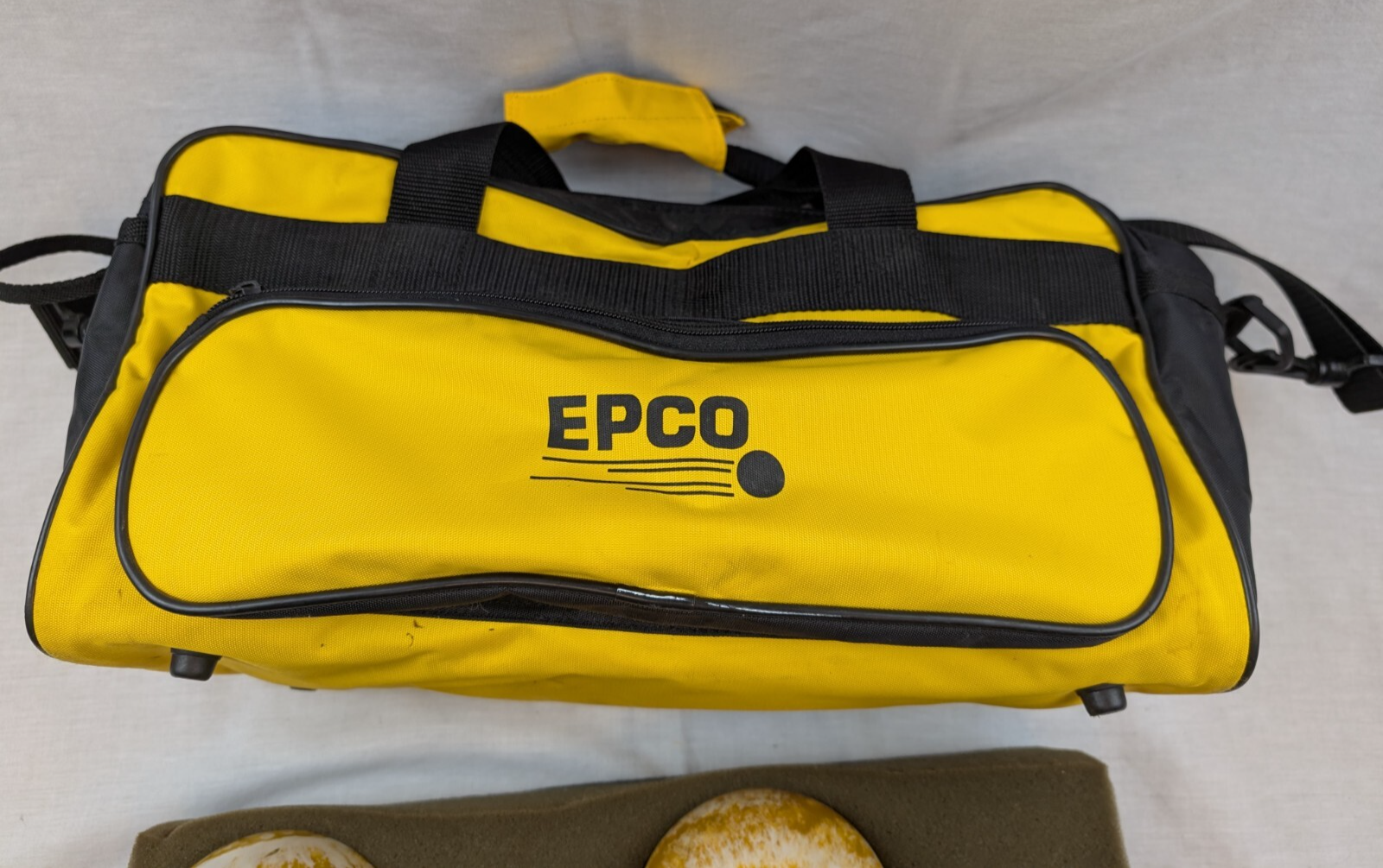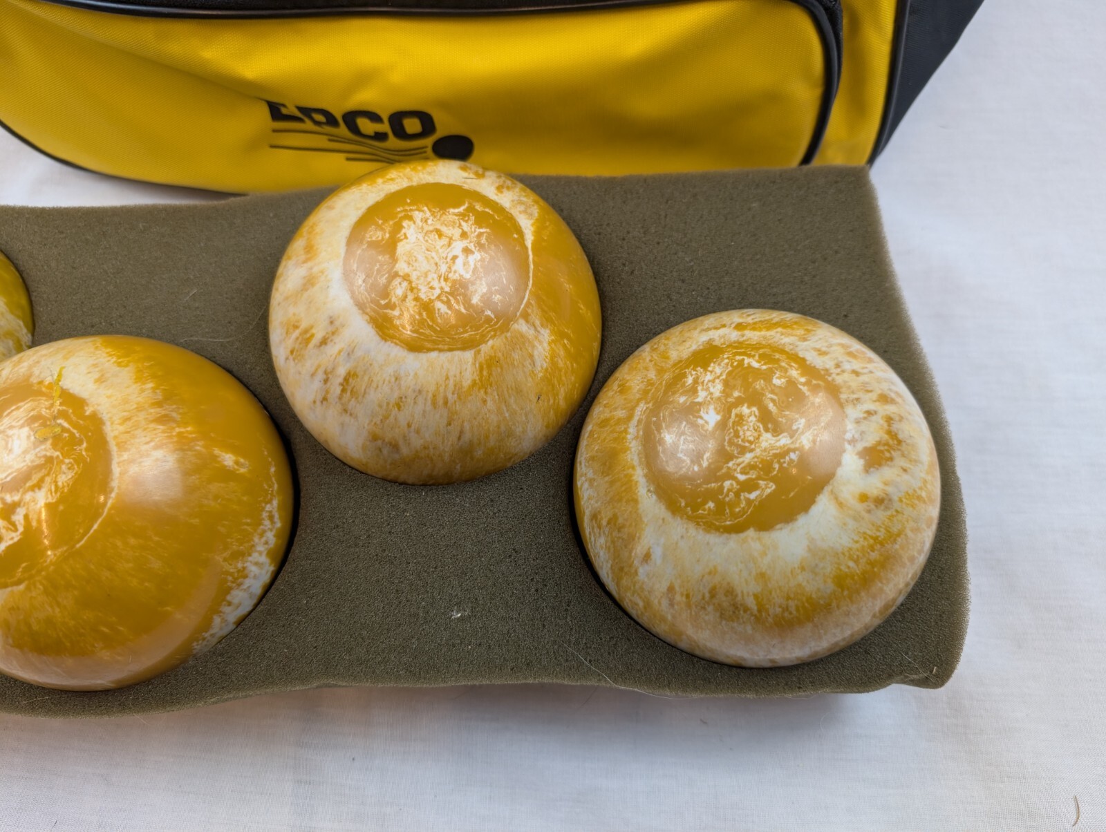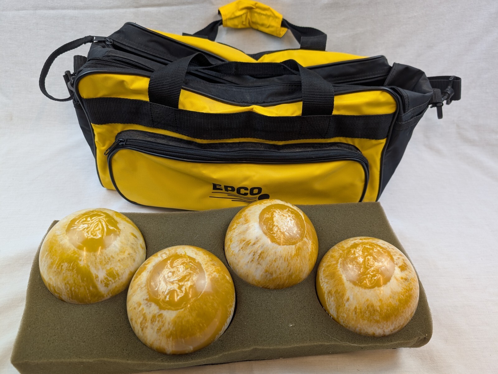 Up for sale is a Lot of 4 Candlepin Balls Epco Paramount Caramel/white swirl yellow carry bag