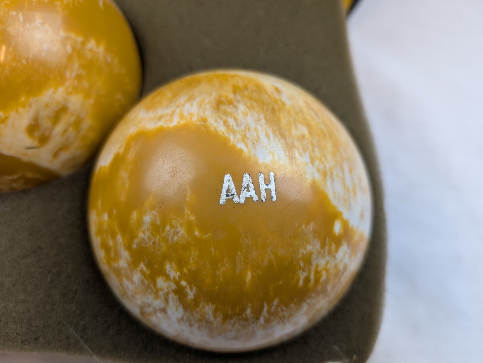 each ball weighs 2lbs 5.2. The balls have a nice polish on them (recently resurfaced??). They ARE monogrammed with prior owners initials -- AAH