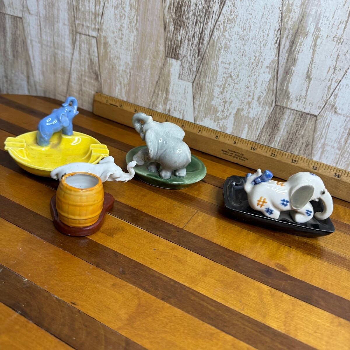 Keywords: ceramic elephants, elephant figurines, trinket dishes, ashtrays, vintage decor, collectible elephants, desk accessories, gifts for elephant lovers, retro collectibles, quirky home decor, small dishes, animal figurines, desk organizer, shelf decor