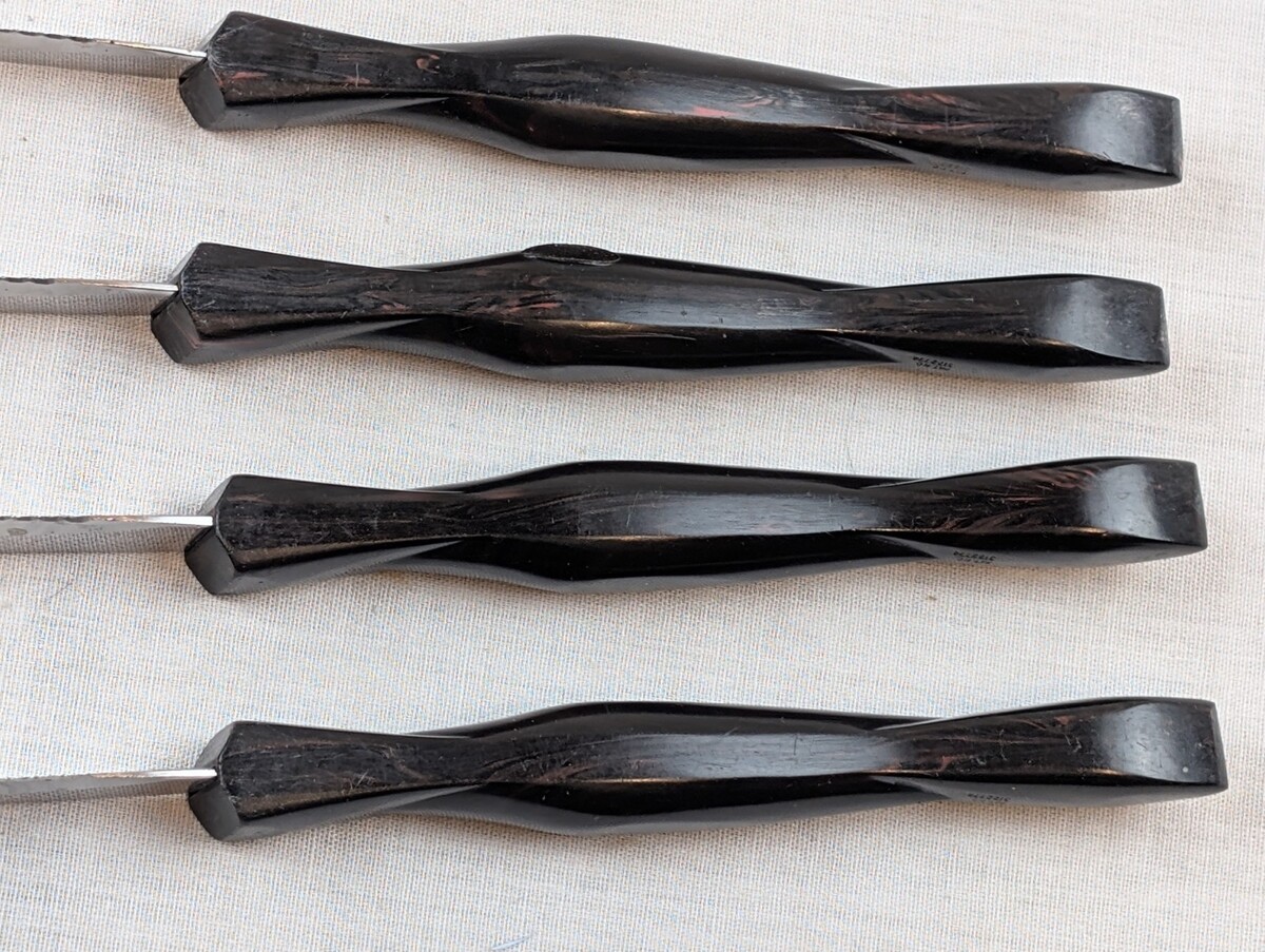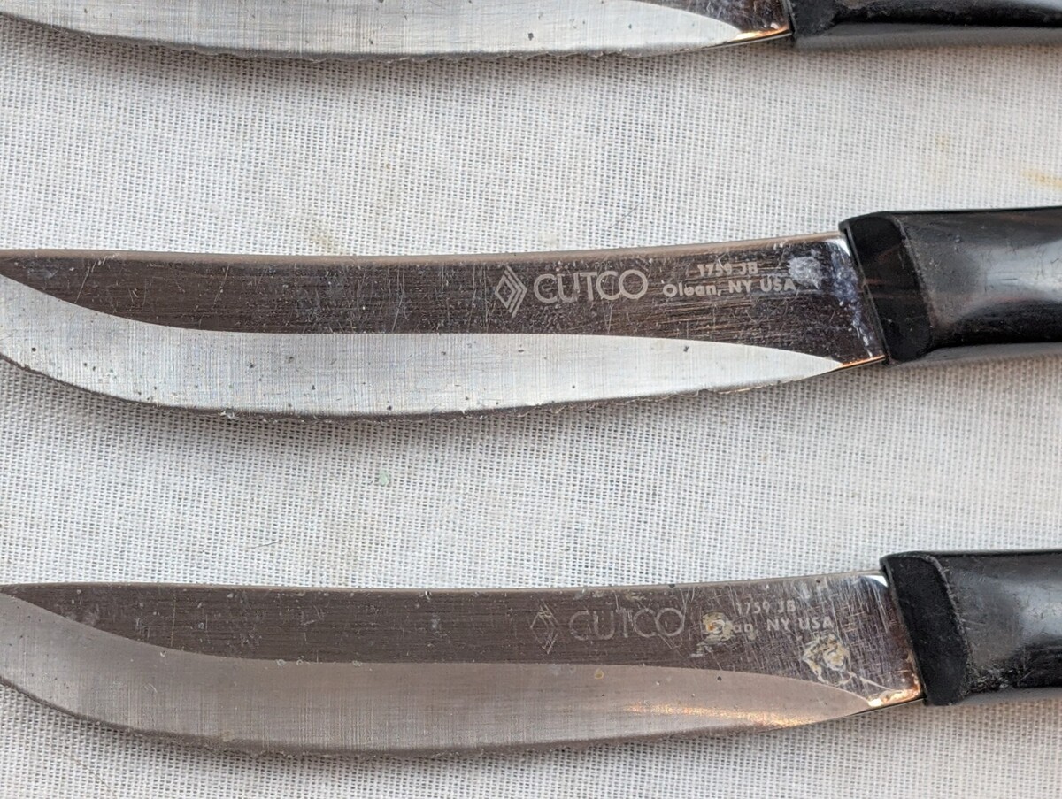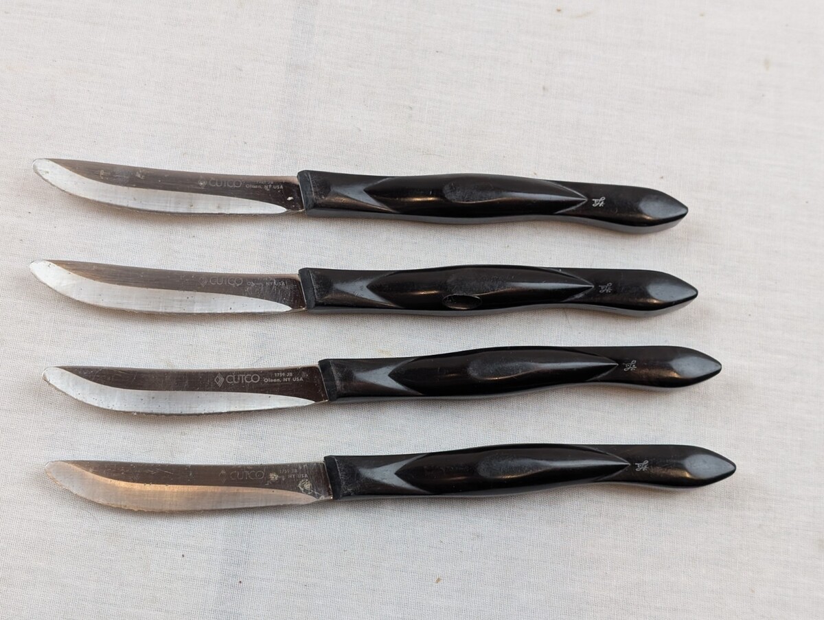 - Lot of 4 Cutco Serrated Steak Knives 1759 JB Black w. Red Swirl Handle 8.5" long