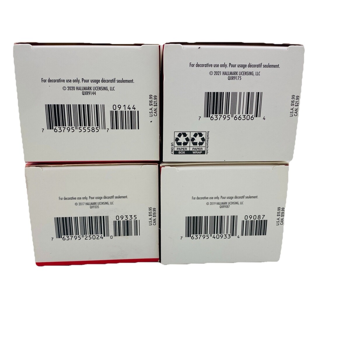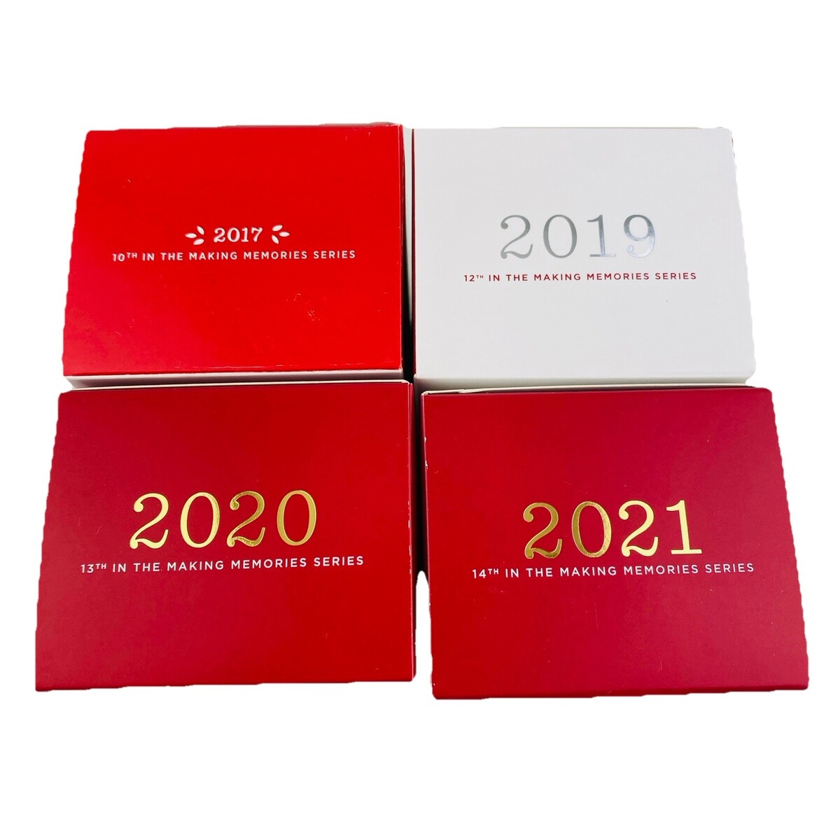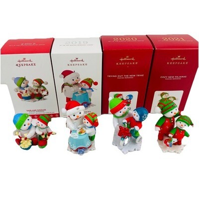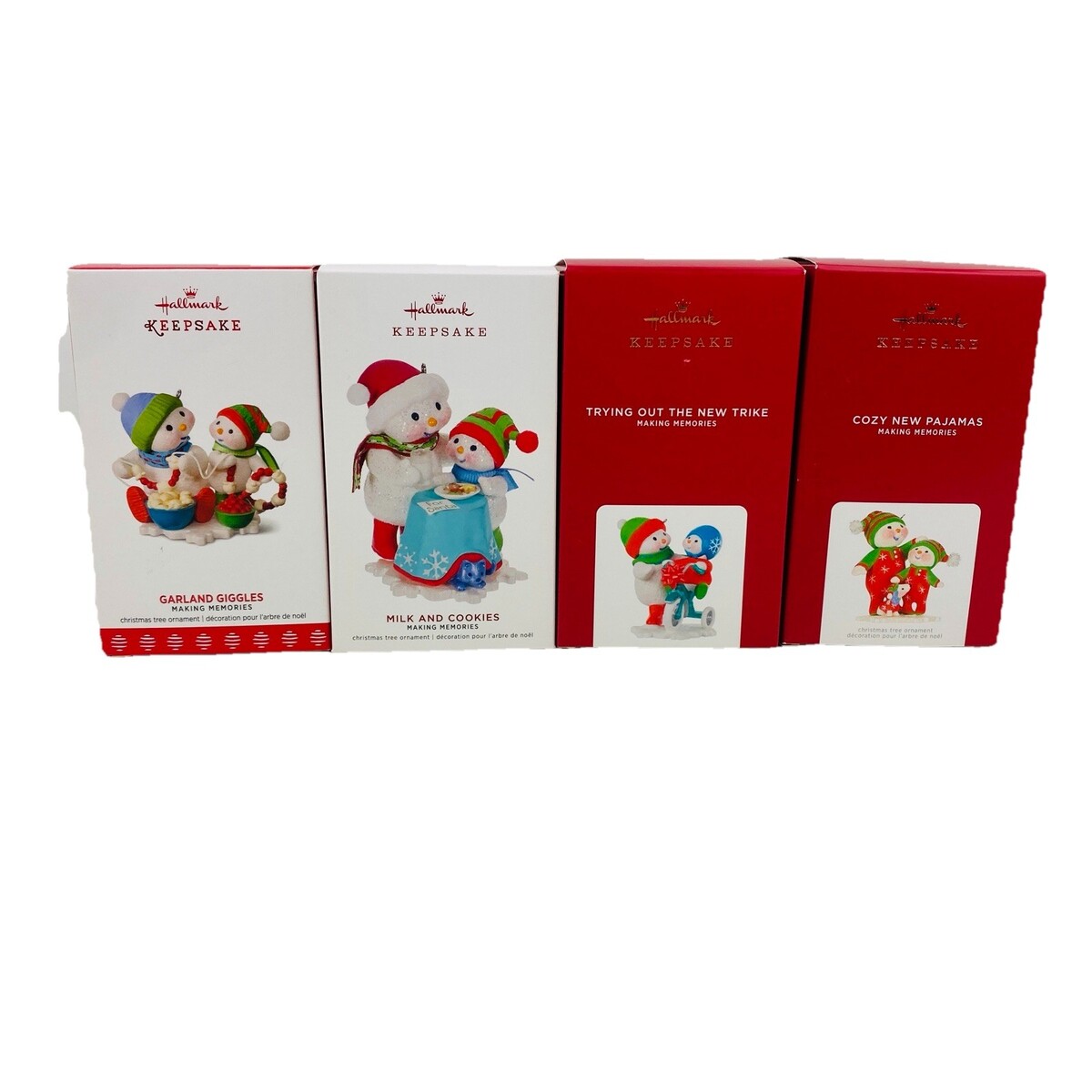 Lot of four Hallmark Keepsake Making Memories Snowman Ornaments ? 2017 Garland Giggles, 2019 Milk and Cookies, 2020 Trying out the new Trike, and 2021 Cozy New Pajamas. All ornaments are like-new in box with original tissue paper packing. Boxes have light shelf wear. From a smoke-free home. Ships next day!