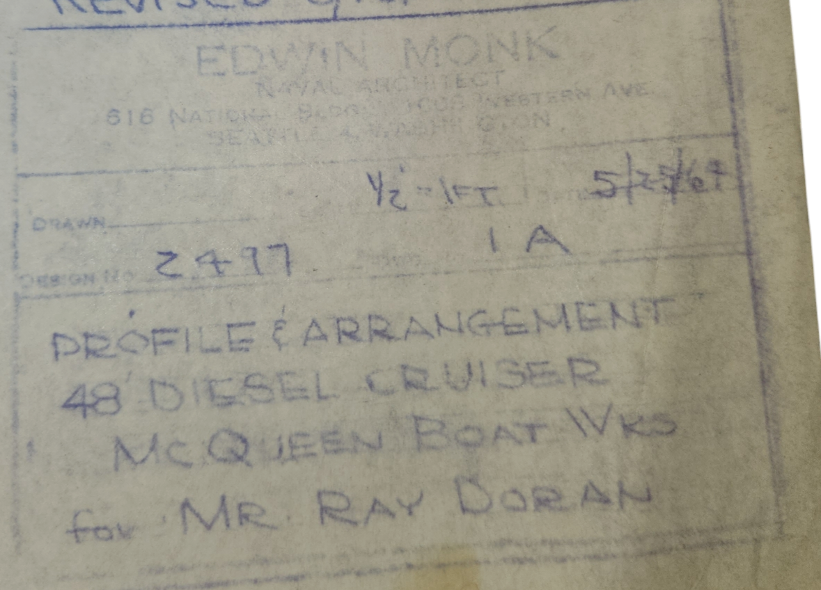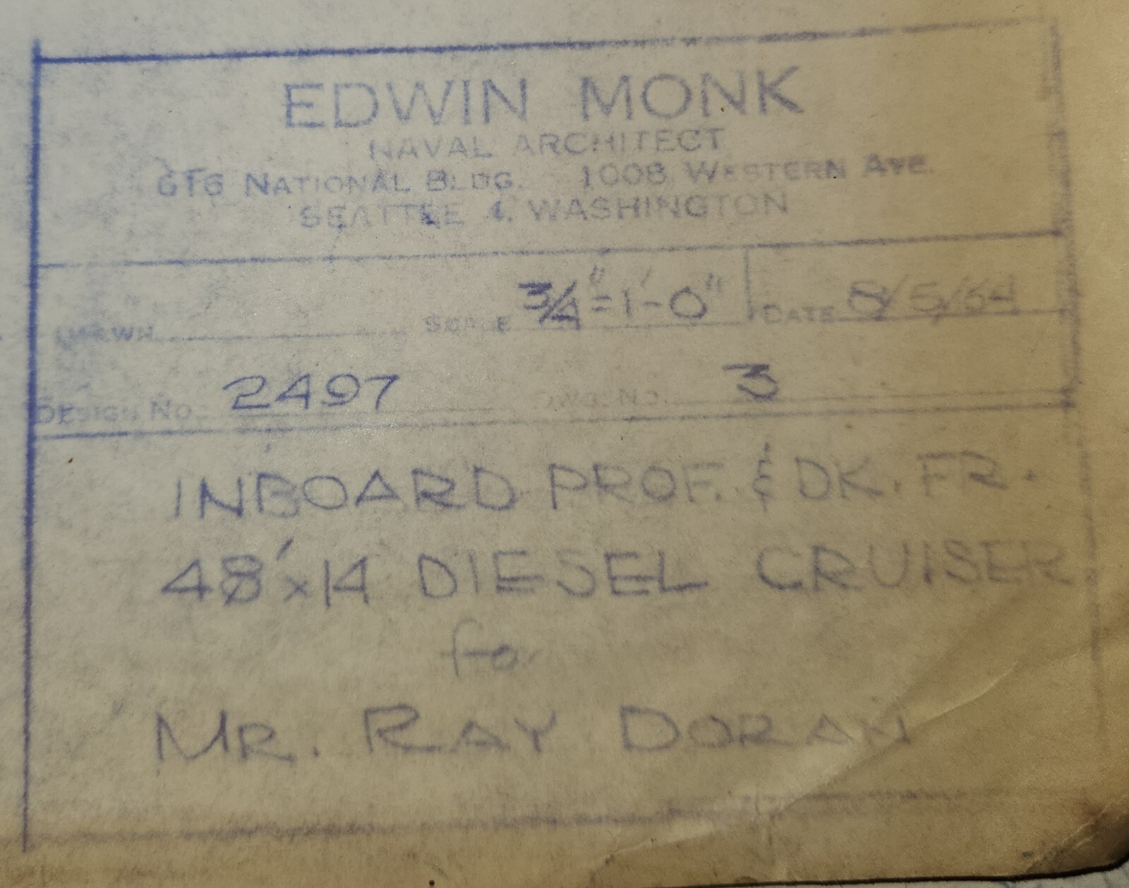 Design #2497 48ft Diesel Cruiser McQueen Boat Works dated 1964 for Mr. Ray Doran 28.5x28"
