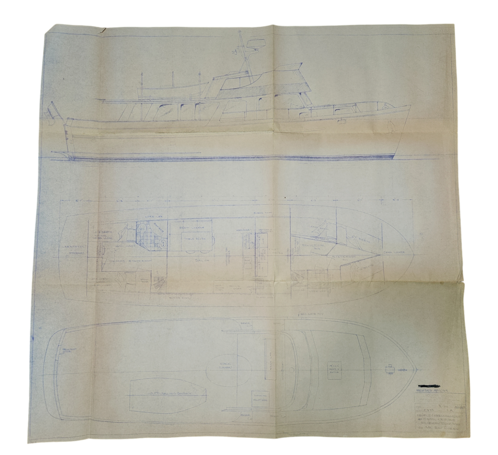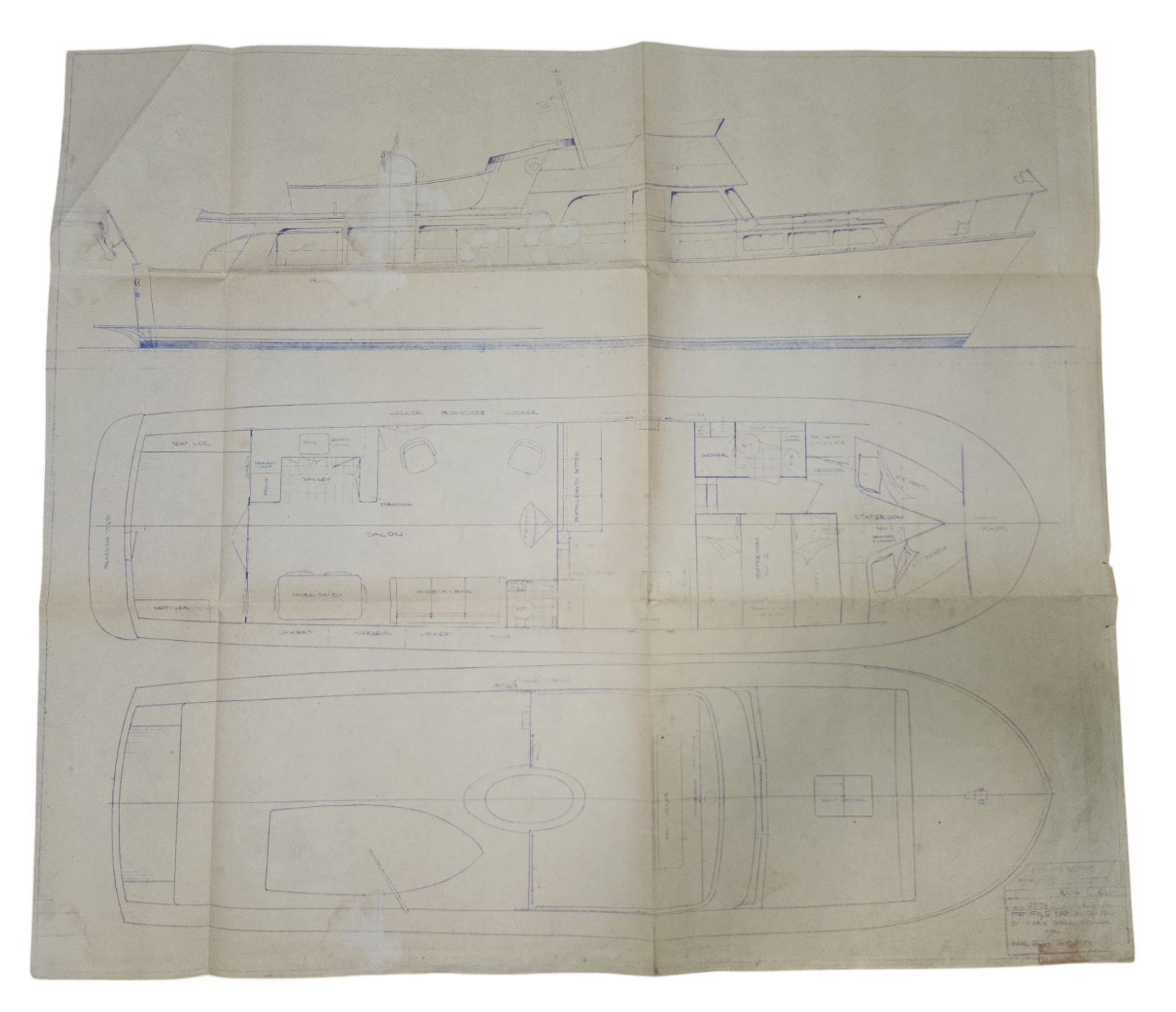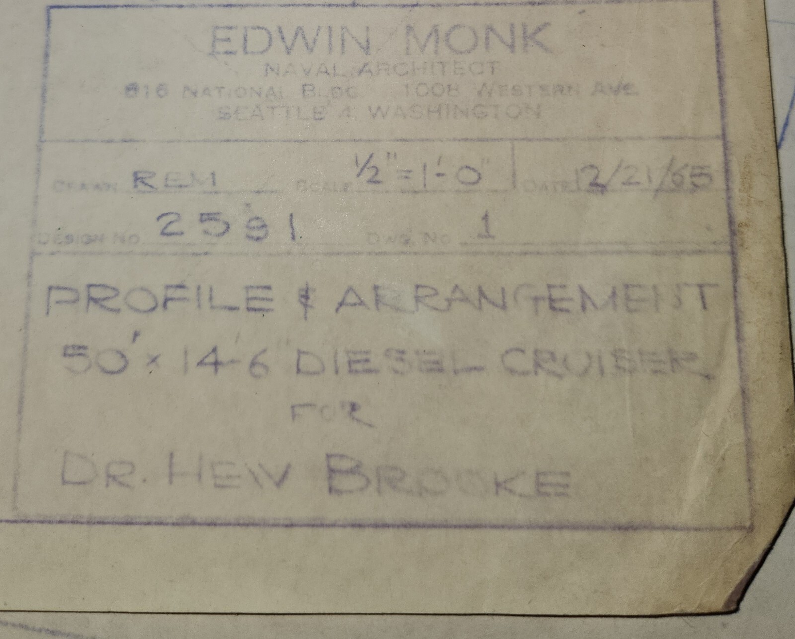 Design #2591 50ft Diesel Cruiser dated 1965 for Dr. Hew Brooke 30x28"